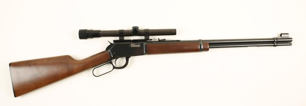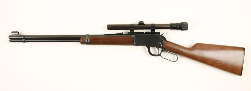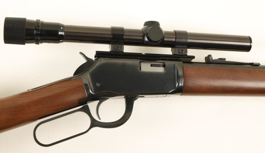 Lever action tube fed rifle cambered for .22 Magnum by Winchester. Features a 20.5" blued barrel, full tube magazine, front hooded ramp sight, semi-buckhorn rear sight, mounted Weaver V-22A 3x -6x scope, blued receiver, lever & hammer, serrated trigger and two piece American Walnut straight grip stock. Condition is very good. ***Modern Firearm***