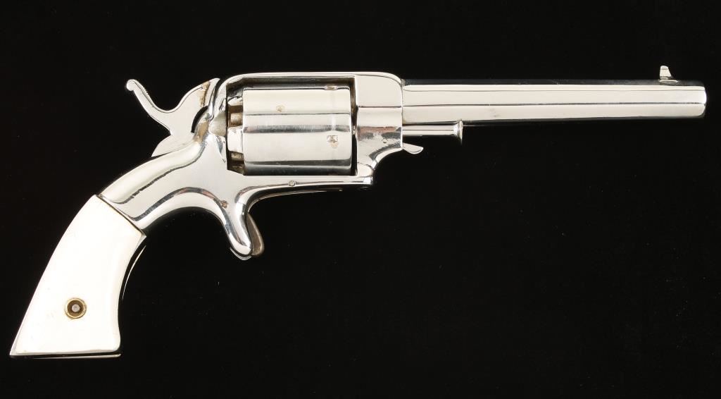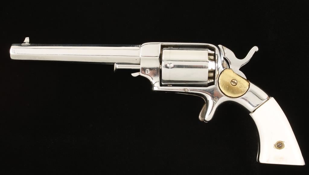 SN: 521 Recently chromed single-action 5-shot percussion revolver with a 5" octagon barrel and replacement synthetic grips. Refinish has removed many roll-stampings and sharp edges. Side plate has been brass plated. All steel construction. Chrome is flaking off of the hammer nose. Bore is dull with light pitting. Chambers are dull and dirty. Action timing is off but lock-up is good once engaged. Grips are loose and ill-fitting. Condition is good + as chromed. *Antique Firearm*