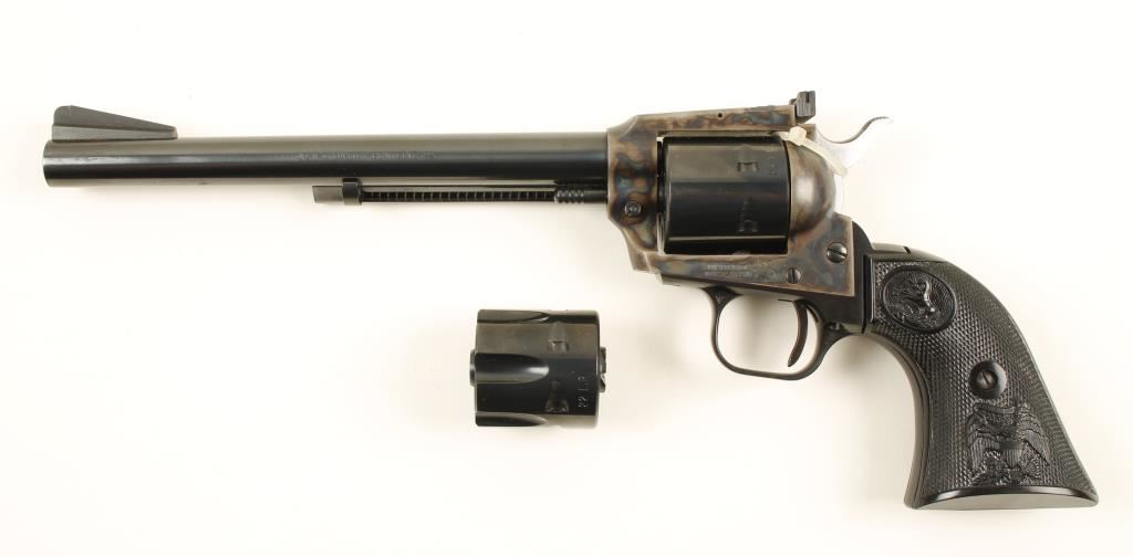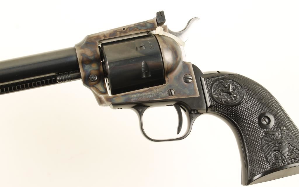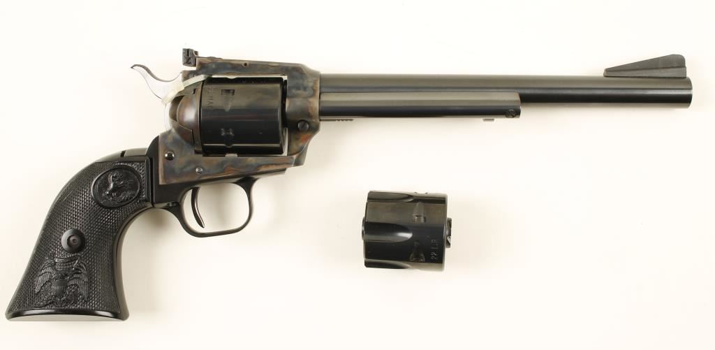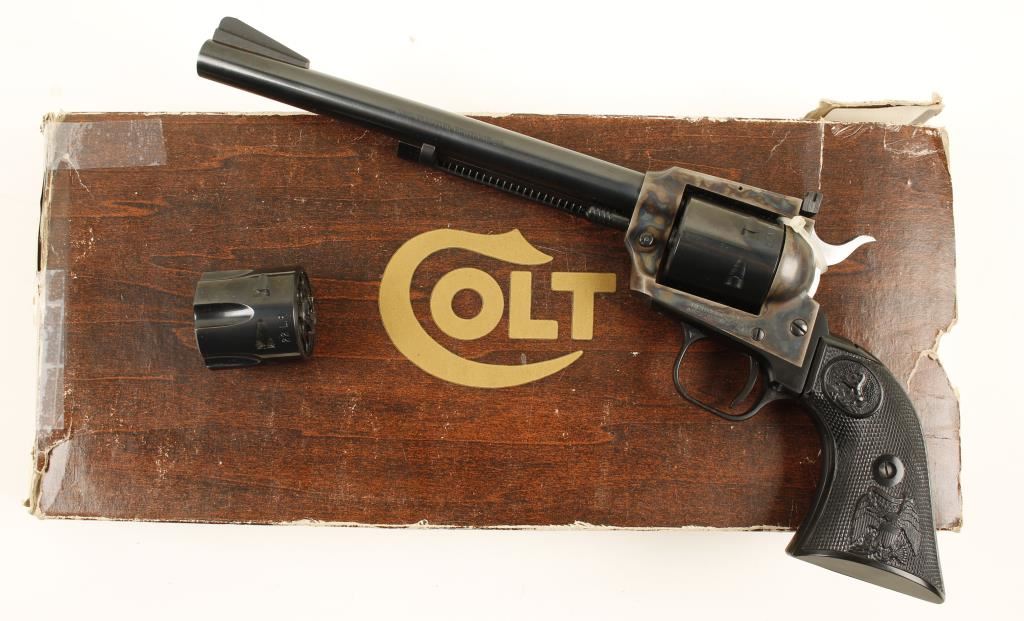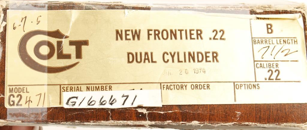 Blued and color cased single-action 6-shot revolver with a 7-1/2" barrel in factory box. Stamped "New Frontier Buntline". Has two cylinders, fluted for .22LR and unfluted for .22 Mag. Cylinder chambers are free from any deficiencies. Bore is immaculate. Finish is bright on barrel, ejector rod housing and cylinders as well as the alloy grip frame. The case colored frame is un-marred. The plastic grips are pristine. Function can't be checked as it came to us with the hammer tied down. The Colt factory box is in poor condition with tears, missing pieces and taped flap. Condition is excellent. *Modern Firearm*
