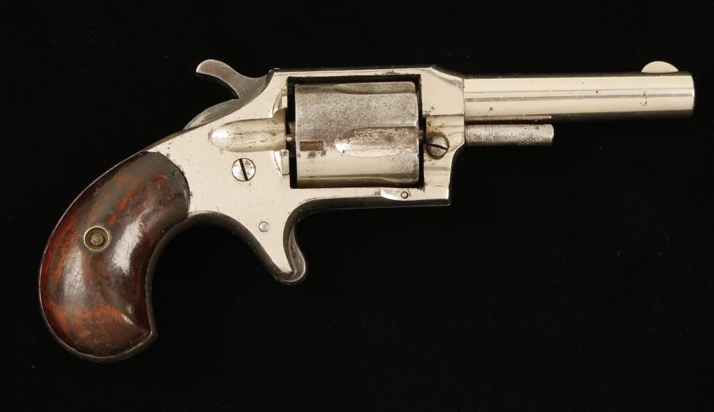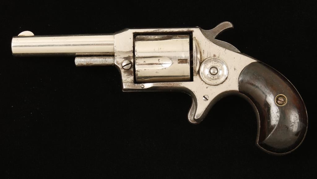 SN: 17722 Nickel plated spur trigger single-action 5-shot revolver with a 2-3/4" barrel and wood grips. Plating, with scratches, remains over 90% of the frame and over 55% of the cylinder. Bore is shiny with deep, sharp rifling and a few spots of rust or pitting. Chambers are shiny with some pitting. Action is great with good lock-up. Grips have high point wear and scratches, dings and small chips on one side. Condition is good to very good. *Antique Firearm*