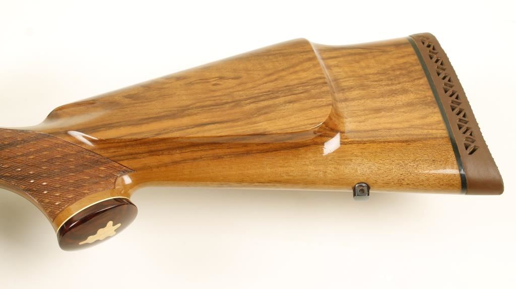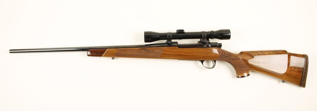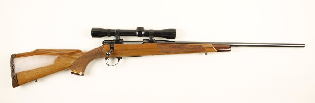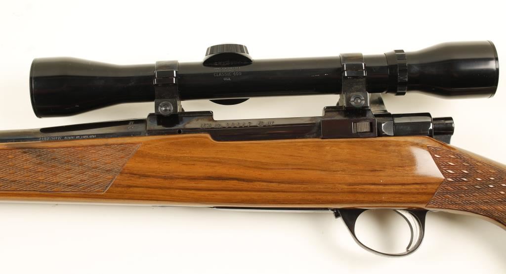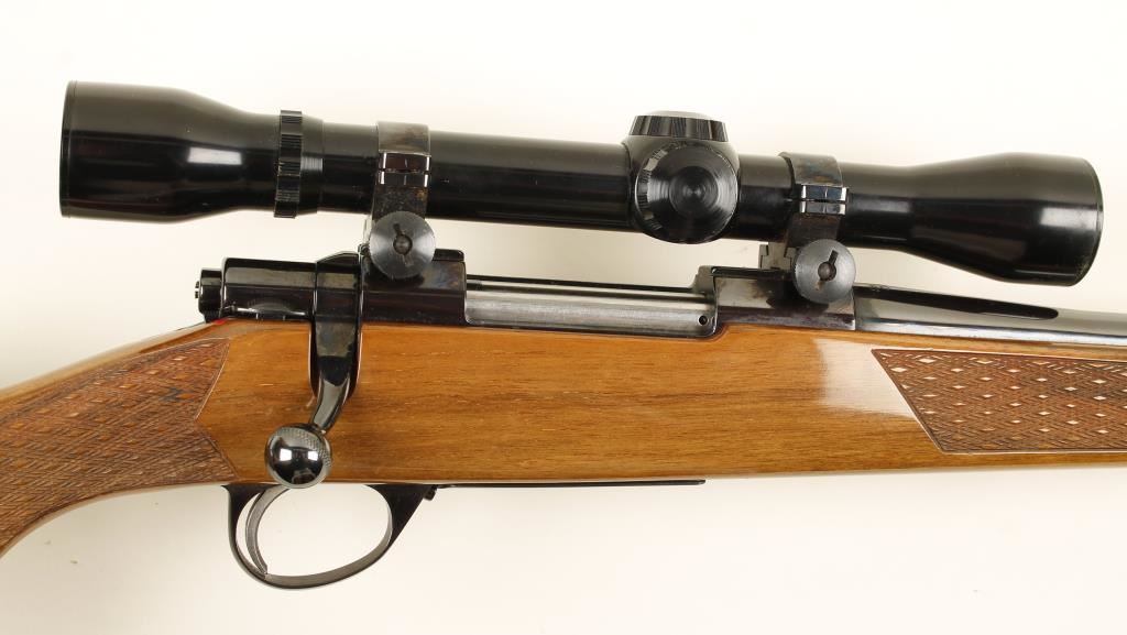 Deluxe grade, Finnish made bolt action hunting rifle chambered in .243 by Sako. Features a 23" blued barrel, mounted Weaver Classic 400 fixed power scope, blued L579 receiver, safety switch, deer scene floorplate and skip line checkered walnut Monte Carlo-style stock with rosewood pistol grip cap and forend tip. Condition is near excellent. ***Modern Firearm***