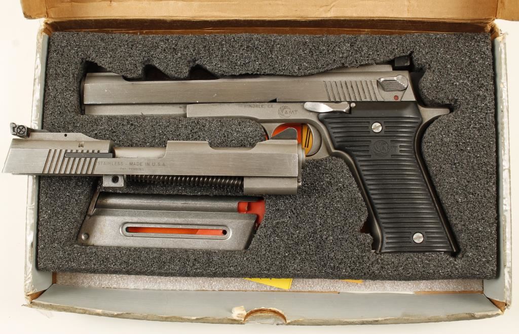 Semi automatic .22 Magnum pistol by AMT. Features both a 4.5" and 6" stainless steel barrel & slide, adjustable rear sight, two 10 round detachable magazines, safety switch and black synthetic grips. Includes original box with fitted foam inserts. Condition is excellent. ***Modern Firearm***
