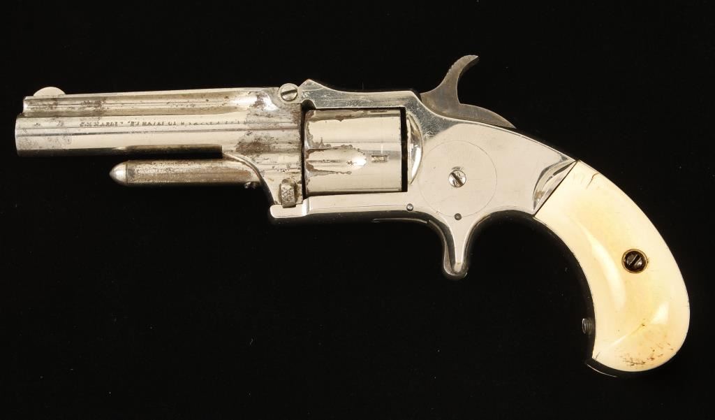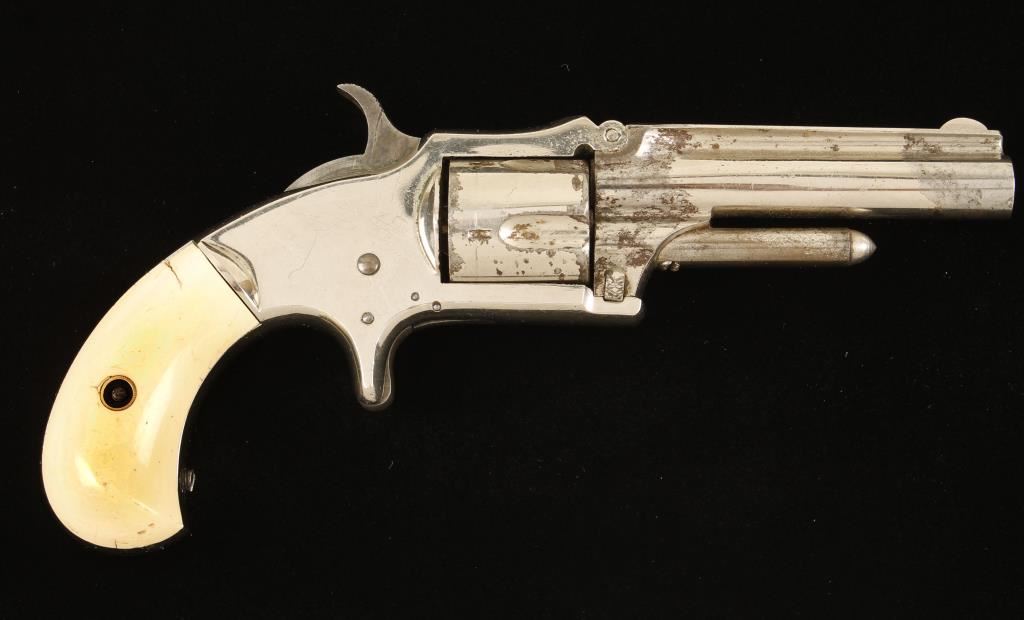 Nickel plated single-action 5-shot spur-trigger rimfire revolver with a 3" tip-up round barrel and synthetic grips. Most of the roll-stamping is legible. Plating is worn and flaking with perforations gone to surface rust but is maybe 85% intact with scratches and dings. Bore is shiny with sharp rifling and some surface rust. Chambers are dark and dirty. Action is very good with tight lock-up of both barrel to frame and cylinder. Grips have cracks emanating from the iron backing plates. Condition is good. *Antique Firearm*