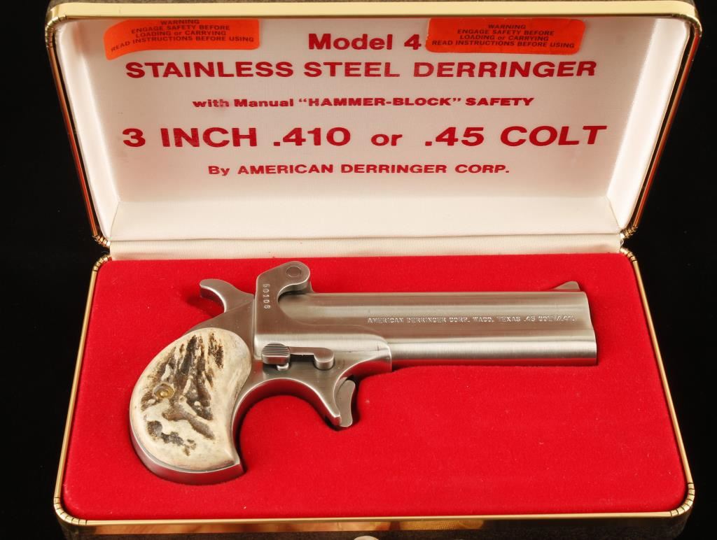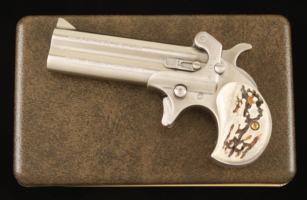 SN: 50106 Stainless over/under pistol with 3-1/8" barrels, factory box, documents and stag grips from Eagle Grips. Exterior finish is very good with a few rubs from the barrel latch lever. Bores are very good. Stag grips are excellent. Condition is very good to excellent. *Modern Firearm"
