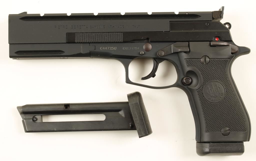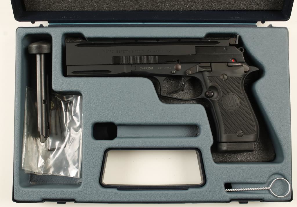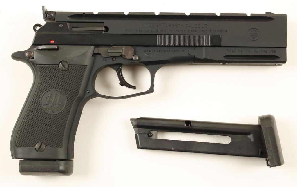 Large single action semi automatic target .22 by Beretta. Features a 5.9" barrel, adjustable sights, weaver style mounting rail, black anodized frame, two ten round detachable magazines, safety switch and black plastic checkered grips. Includes Beretta fitted box with foam inserts, cleaning brush and tools. Condition is excellent. ***Modern Firearm***