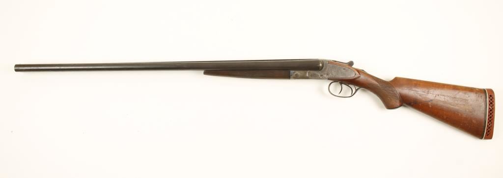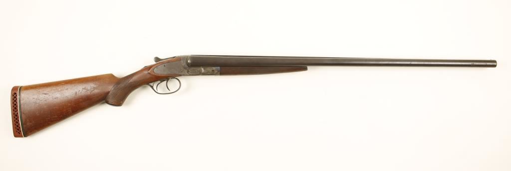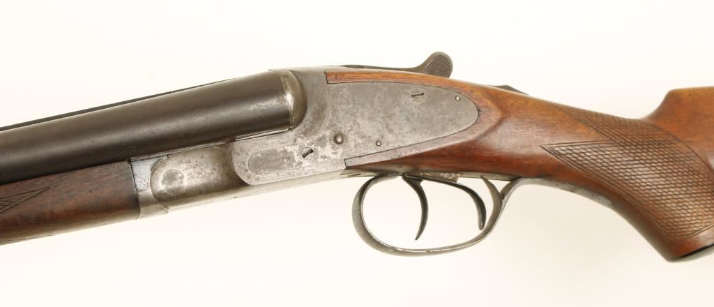 Blued and case-colored double barreled side-by-side sidelock shotgun with 28" barrels and pistol grip stock. Possibly made in 1927. Finish has freckles of surface rust and some pitting. Very little visible color in the case hardening. Bores are mirror bright. Action locks up tight but the back trigger doesn't work. Screw head slots are misshapen but not buggered. Butt stock has a plastic grip cap and a poorly fitted recoil pad. Both pieces of wood are very worn with the checkering almost smooth in spots. There are many dings and rubs in stock and forend. Condition is fair. *Modern Firearm*