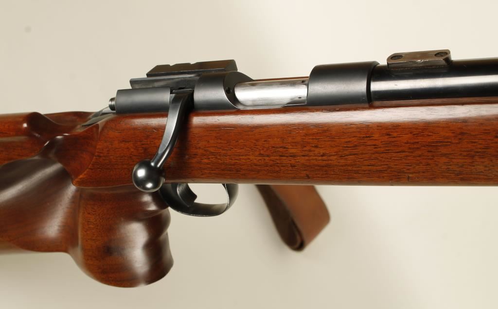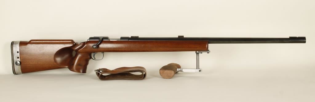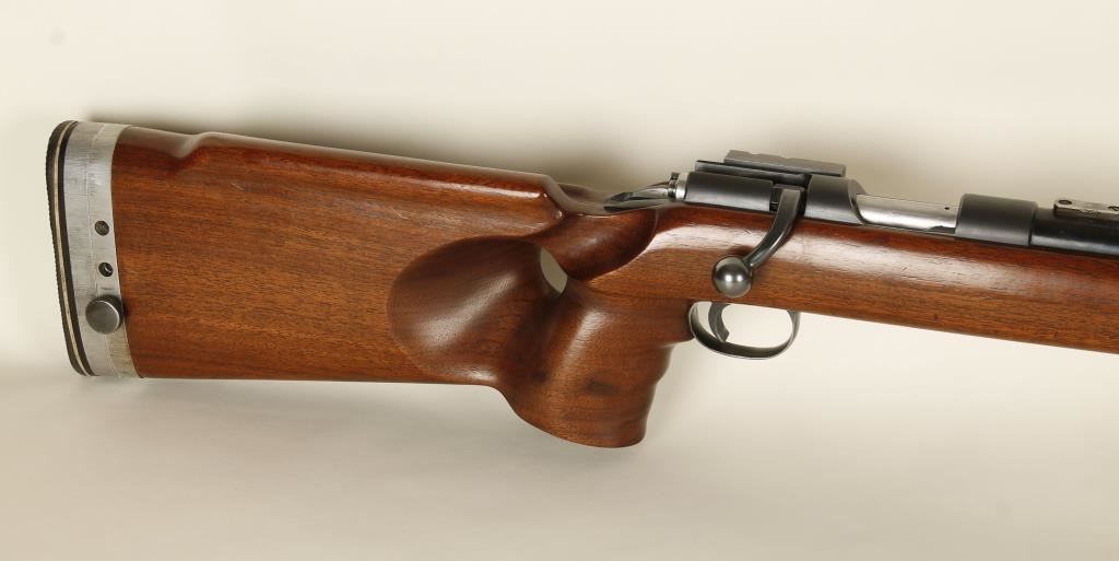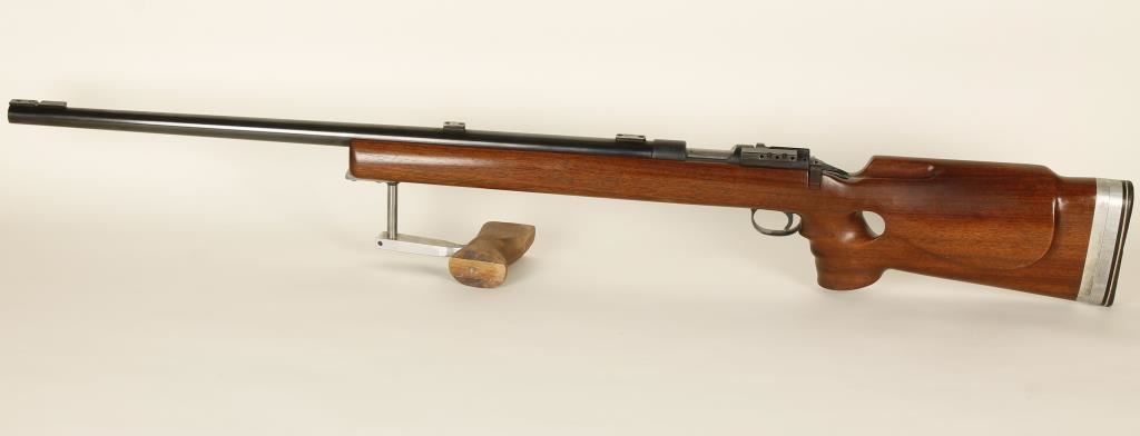Custom thumbhole stock for a right-hander. Douglas premium grade 28" barrel, custom adjustable butt plate and Canjar trigger with shoe. Arm cuff and forend stop. The gun that won National 1962 Championship in Oregon by competition shooter Pat Kaufmann. With dovetailed scope bases and globe front sight base. Bore is immaculate. Single feed magazine. Action is faultless. Straight taper barrel with a diameter at muzzle of 0.827", 1.048" at receiver. Bluing is in great condition. Stock has a few minor dings and scratches. Condition is excellent. *Modern Firearm*