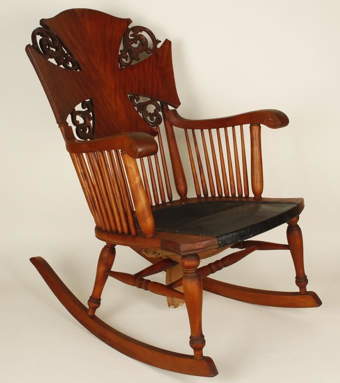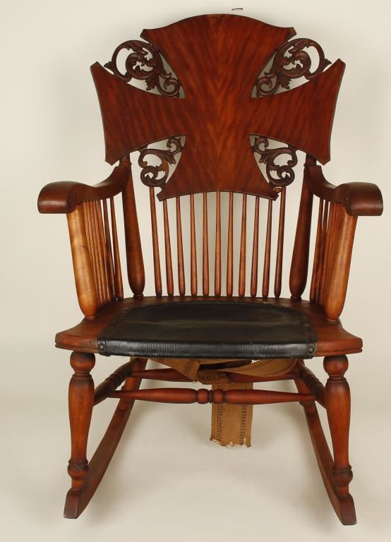 Large cross design on chair back that has scroll designs carved on each side. Black leather tacked seat that is coming apart on the underside. 36"x23"x32"