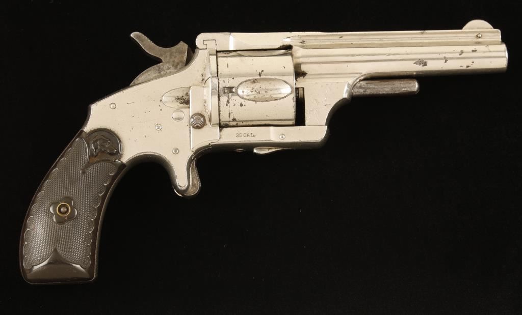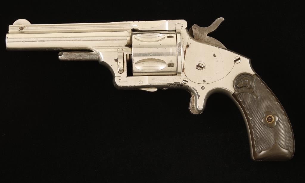SN: NVSN Nickel plated spur-triggered single-action 5-shot center-fire revolver with a 3-1/2" barrel and checkered hard rubber grips. Second style early production made by Merwin & Hulbert at the Hopkins & Allen factory in Norwich, CT. in the late 1870s or 1880s. Plating is about 80%+ with penetration showing rust, scratches and dings. The grips have wear to the checkering but they are 100% complete. Bore has rifling with spots of pitting and surface rust. Action works well with good lock-up. Condition is very good. *Antique Firearm*
