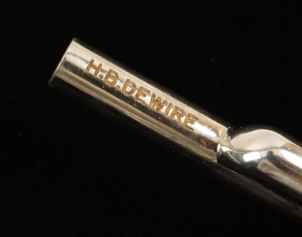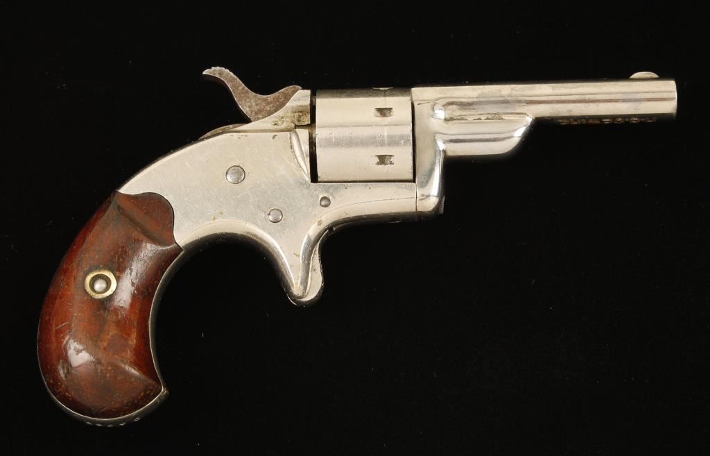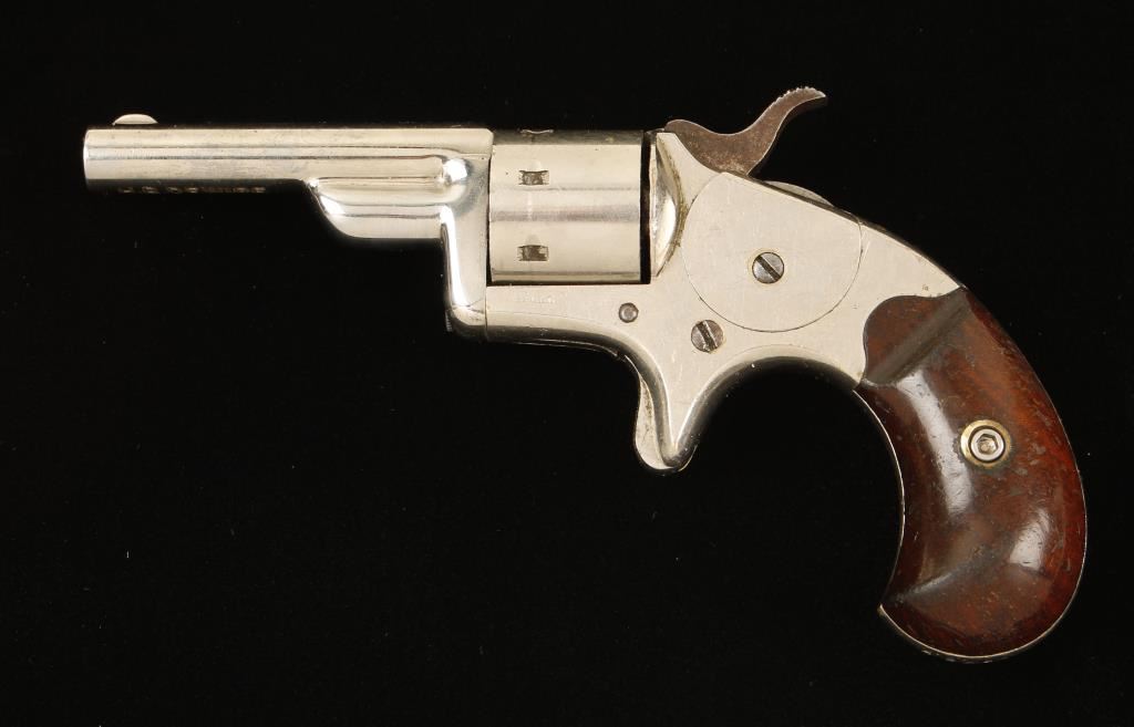 Nickel plated single-action spur trigger 7-shot one-off revolver with a 2-3/8" barrel and wood grips. Plating is scratched and dinged but almost 100% intact with some wear/flaking showing the underlying brass/steel. There is a drag line. Barrel is marked, "Colt's Pony Pistol" on top and, "H.B. Dewire" on the bottom. Bore is shiny with worn rifling. Chambers are dirty or pitted. Action works well with tight lock-up. Grip screw and barrel retaining screw are now hex head screws. Grips are worn with loss of varnish and some dings/scratches. Condition is good. *Antique Firearm*