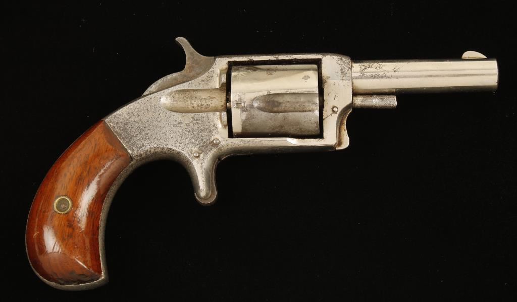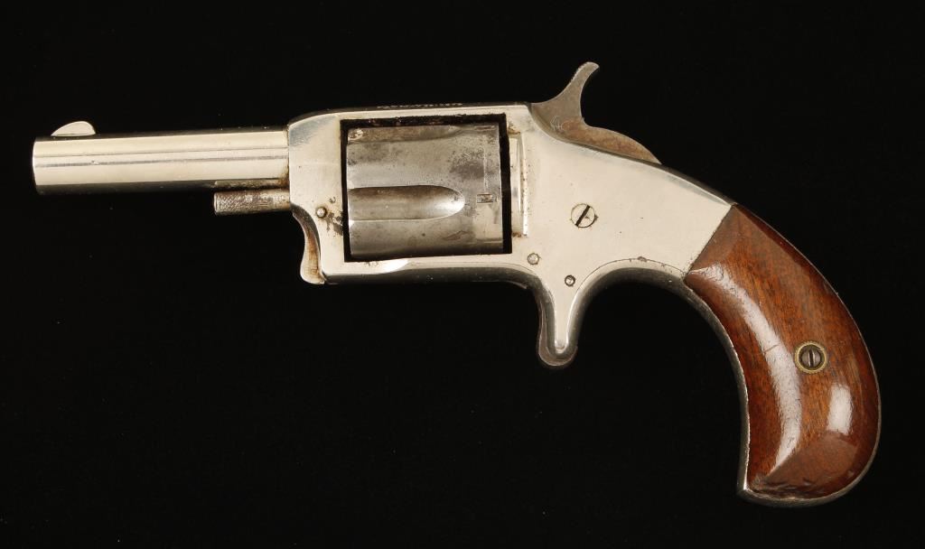 SN: NVSN Nickel plated single-action spur trigger 5-shot rimfire revolver with a 2-1/2" barrel and wood grips. Plating on the frame is probably more than 50% intact with light scratches and dings. The cylinder retains less than 25% of the plating with primarily pin prick pitting. The remainder is surface rust or pitted. The bore is dark with rifling and pitting. Chambers are filthy. Action is fine with good lock-up. Condition is poor. *Antique Firearm*