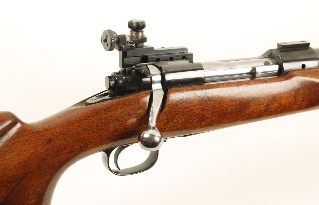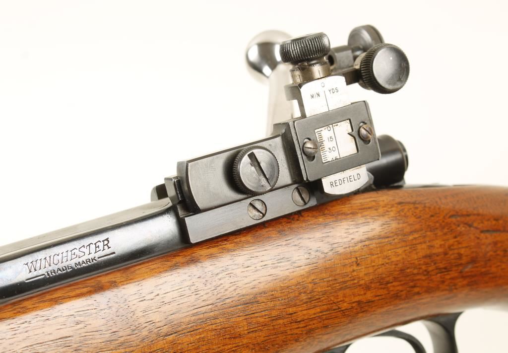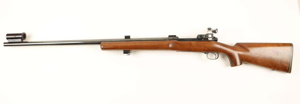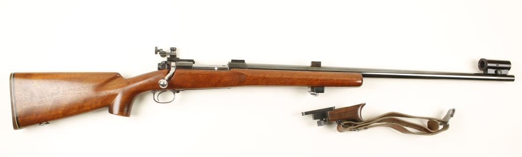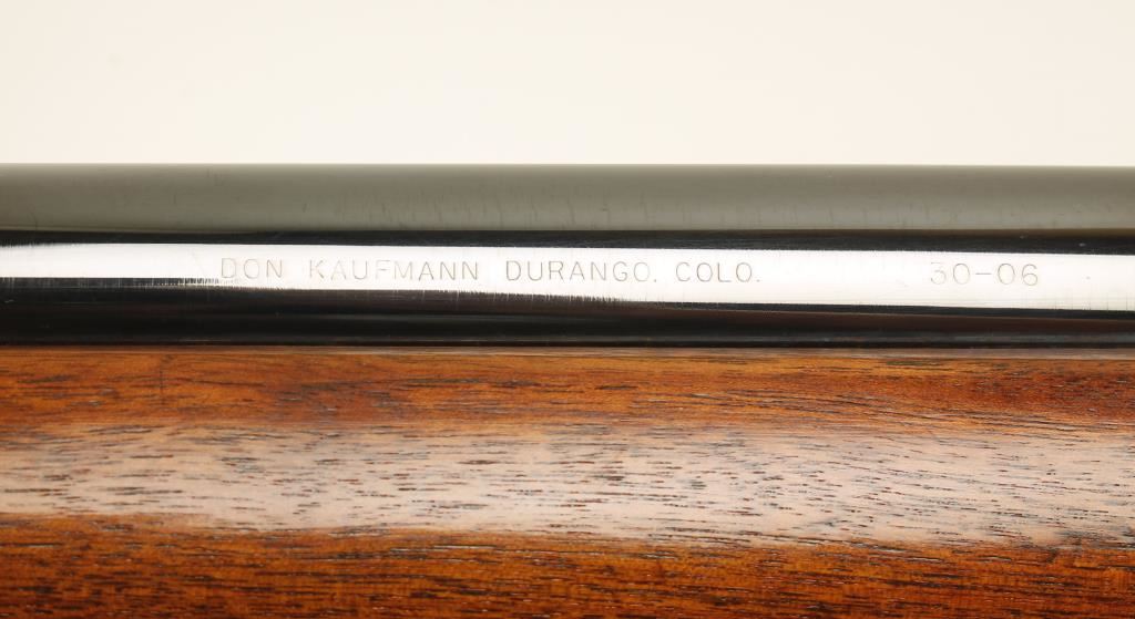 Pre-64. Blued bolt action target rifle with a 28" straight taper barrel and beavertail walnut stock. Made between 1944 and 1947, has dovetail mounts for scope. With Redfield Olympic peep sight and globe front sight. Transition safety lever. Cloverleaf receiver tang. Marked on barrel, "Don Kaufmann Durango Colo." and "30-06". The bore is pristine. Bluing is great. Walnut stock has a few minor dings and dents but the inletting may have originally been for a different action and other hardware. The inletting is not tight to the cloverleaf tang and it is longer than both the bottom metal and the hand stop rail. There are sling swivels. Action works well. Safety is stiff to engage. Condition is excellent. *Modern Firearm*