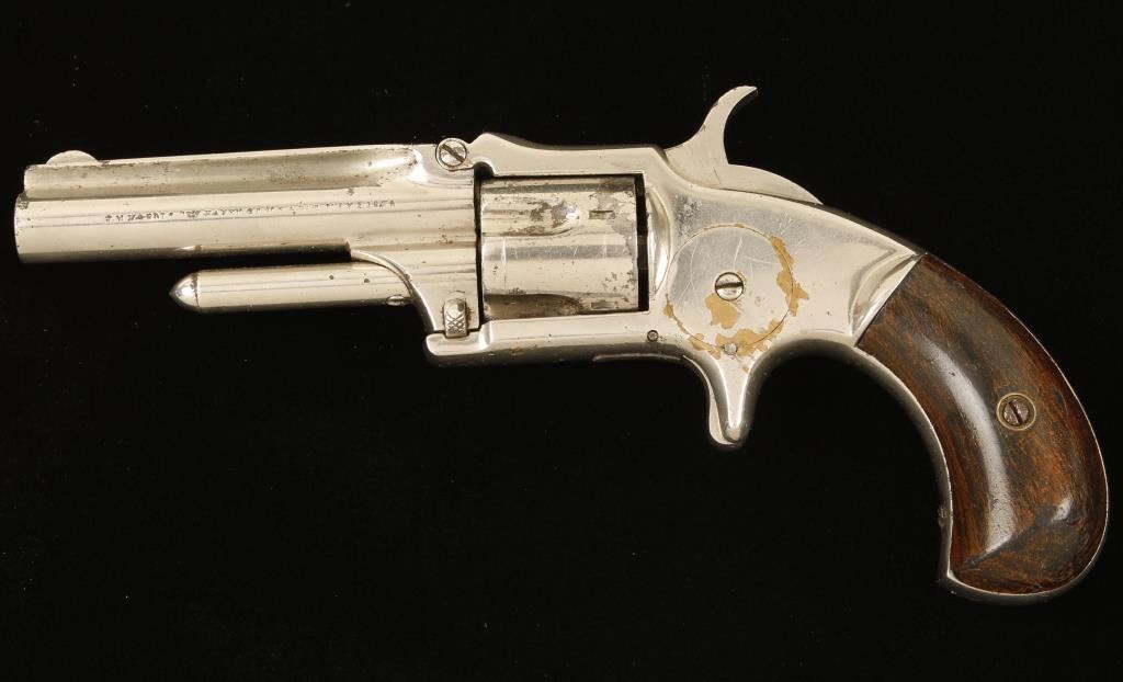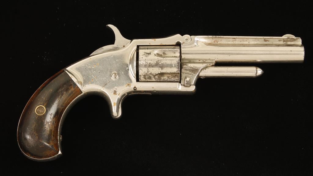 Nickel plated single-action spur trigger 5-shot rimfire revolver with a 3" tip-up round barrel and wood grips. Barrel hinge is solid. Plating has worn or flaked off much of the cylinder and parts of the frame leaving pitted/rusted steel and exposed brass. There is a slight drag line. Bore is somewhat shiny with rifling and some pitting. Chambers are dirty with what may be some pitting. There is a drag line. Action is good with tight lock-up. Grips are worn through the finish in spots with a few scratches and dings. Condition is good plus. *Antique Firearm*