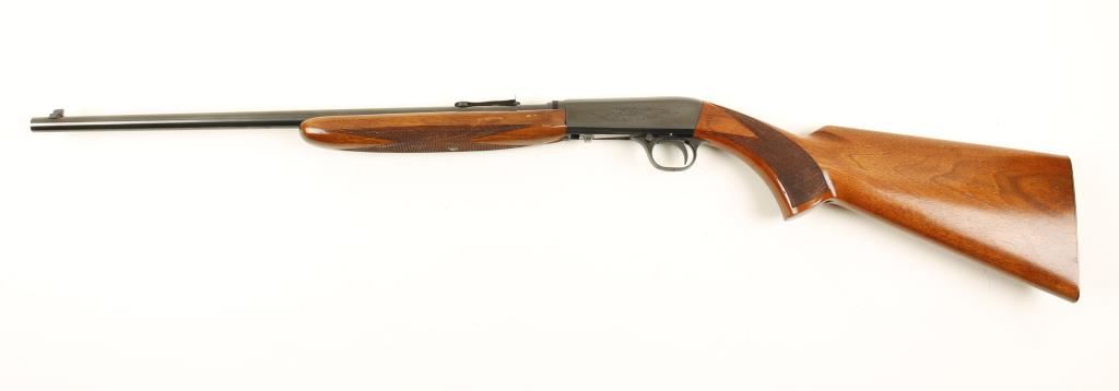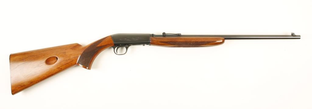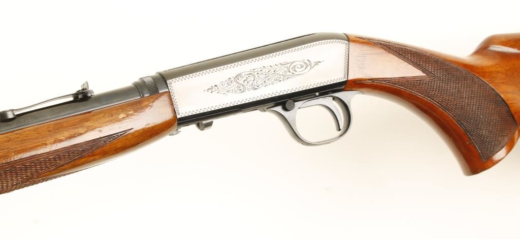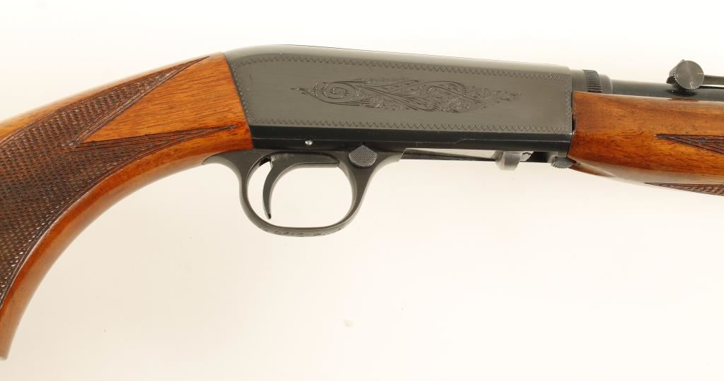 Early Belgium made Grade I .22 Caliber Semi-Auto blowback operated tube-fed rifle by Browning. Features a blued 19.25" blued take-down barrel, wheel rear sight, engraved blued receiver, 11 round tubular magazine & checkered walnut stock. Condition is very good to excellent with only minor blemishes to gun and stock. ***Modern Firearm***