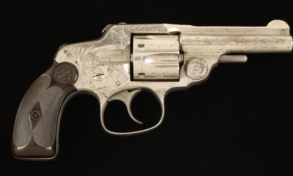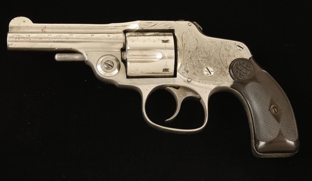 Spencer Safety Hammerless Revolver. Nickel plated and engraved 5-shot double-action only solid steel framed revolver with a 3-1/8" barrel and hard rubber grips. Plating is lightly worn with the engraving having been done after the plating so the deep cuts penetrated the nickel and have turned to patina. There is a drag line and some other penetrations in the nickel. The bore retains rifling with pitting (some of it heavy). Chambers are dirty and dull with some light pitting in one. Action works well with the cylinder stop bolt in the topstrap. There is a safety on the knuckle above the grip to lock the action. The grips show very little wear and are 100% complete. Condition is very good. *Antique Firearm*