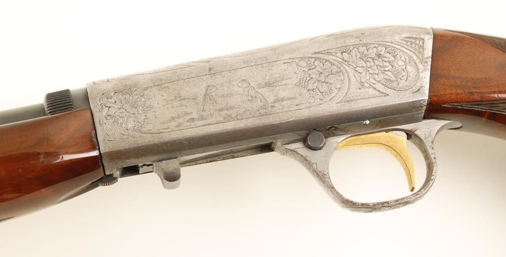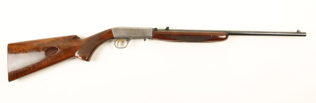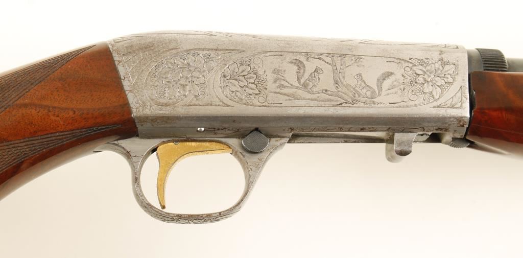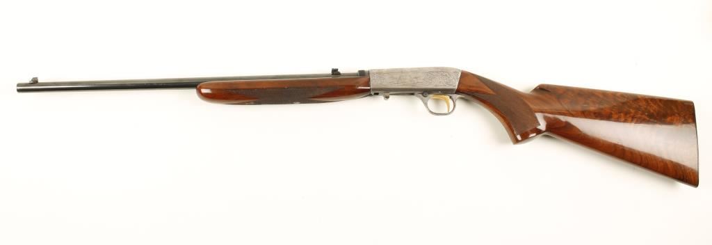 SN: 57B01479 Belgium made Grade II .22 Caliber Semi-Auto blowback operated tube fed rifle by Browning. Features a 19.25" blued take-down barrel, adjustable flip up rear sight, engraved French greyed receiver with squirrel, scroll, and duck motif, gold plate trigger, 11 round tubular magazine & checkered select grade wood stock with metal butt plate. Condition is very good with blemishes to stock and scratches and wear on receiver and trigger guard. ***Modern Firearm***