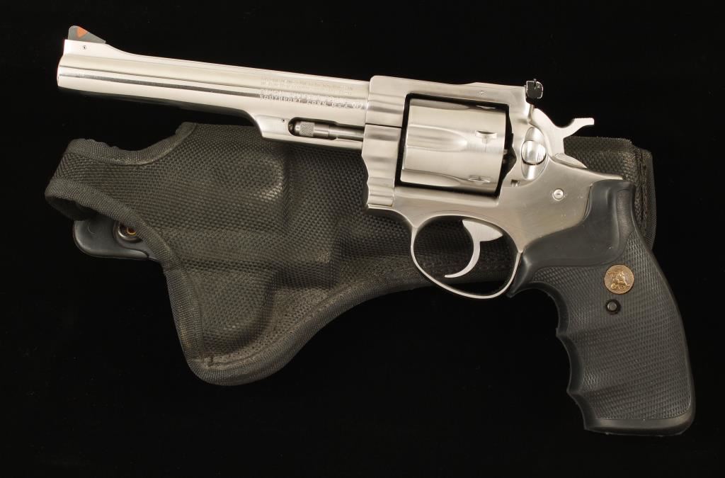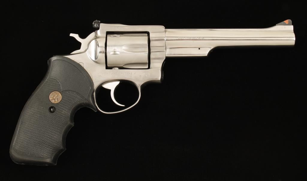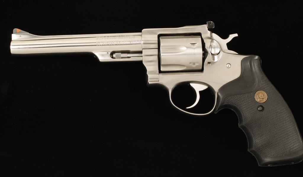 Square butt double action six shot revolver in .357 Magnum by Sturm Ruger & Co. Features a 6" stainless steel barrel, ramped front sight with orange insert, adjustable rear sight, stainless cylinder and frame with Hogue black rubber grips. Includes Bianchi molded nylon holster. Condition is very good. ***Modern Firearm***