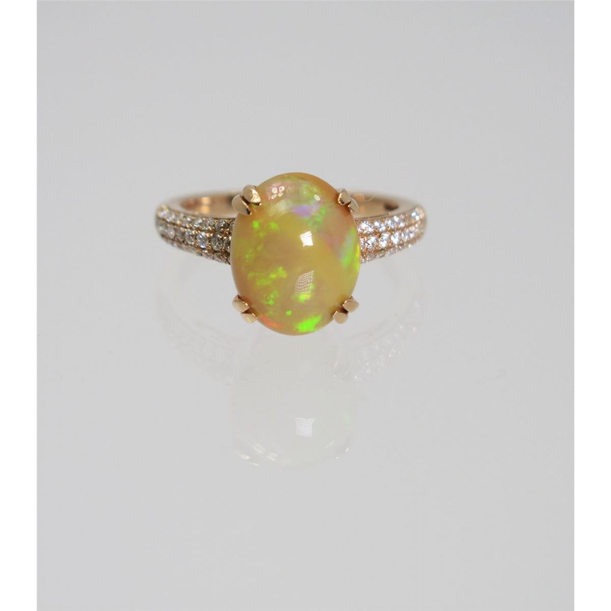 FINE, approx 5.00 carat opal with vibrant green and orange color flashes accented with 54 micro set diamonds weighing approx. 0.50 carats total with G-H colors and VS clarity set in 14 karat rose gold.
