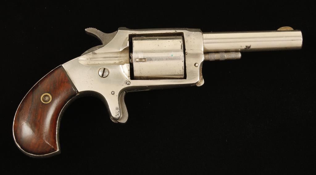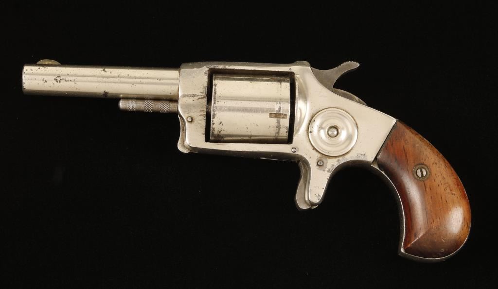 SN: NVSN Nickel plated single-action spur trigger 5-shot rimfire revolver with a 2-7/8" barrel and wood grips. Plating is about 80% , edge wear, dings and other rusted perforations in the finish. The bore is rifled with pitting. Chambers are dull and lightly pitted. Action doesn't rotate the cylinder easily. The grips are slightly smaller than the frame but have little damage to them. Condition is good. *Antique Firearm*