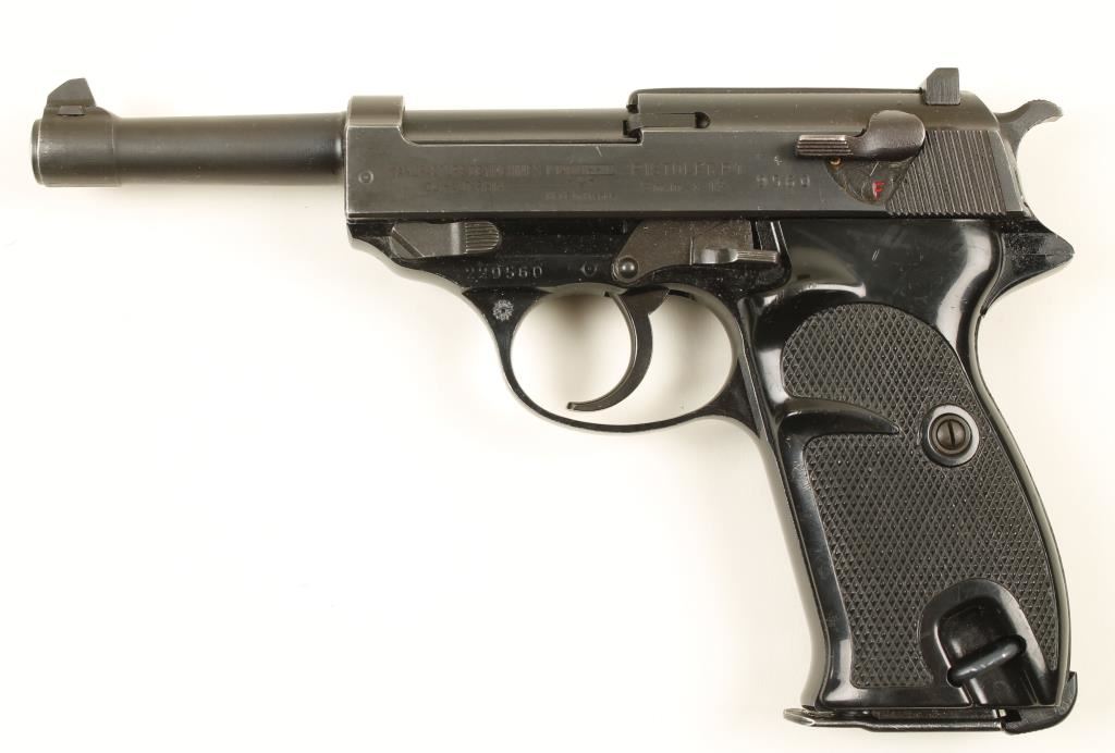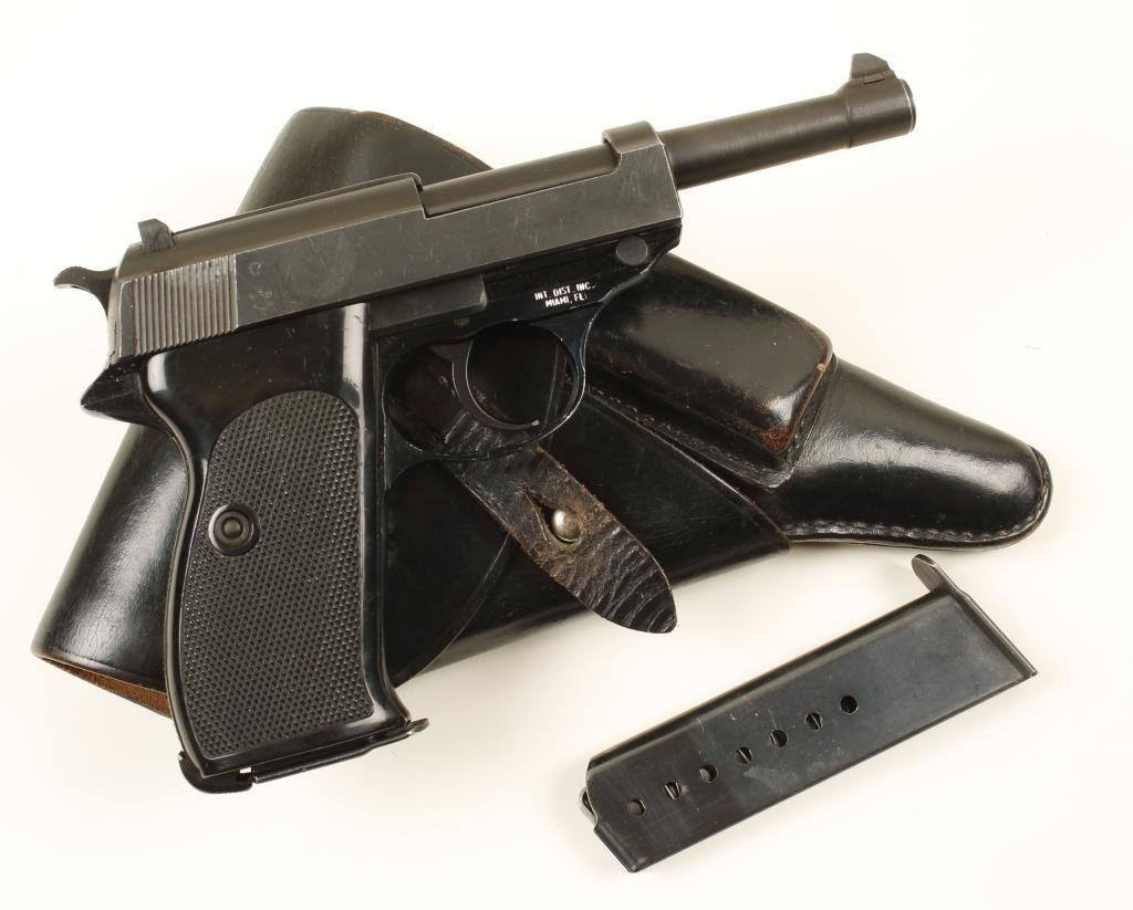 Blued double-action semi-automatic pistol with a 5" barrel, two magazines marked "P1", tactile loaded chamber indicator, decocker, leather flap holster (made in 1963) and plastic grips. Alloy frame has some edge wear and is import marked. Blued steel has light edge wear and some rubs and tiny scratches. Bore is mirror bright with good rifling. Action works well. Grips have some small scratches and dings. Condition is excellent. *Modern Firearm*