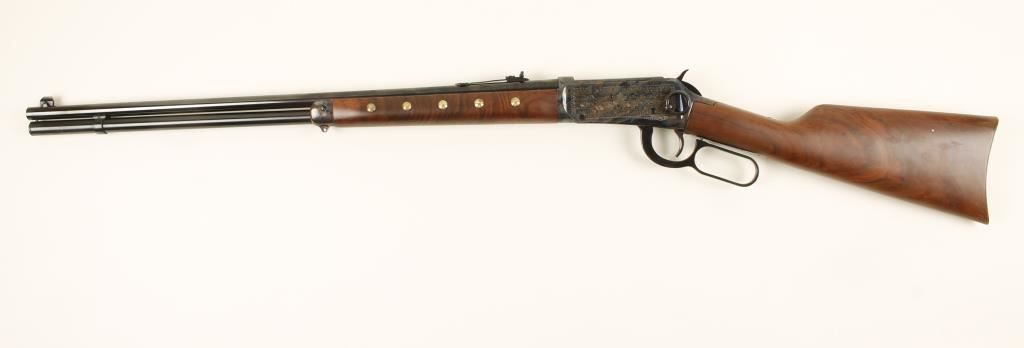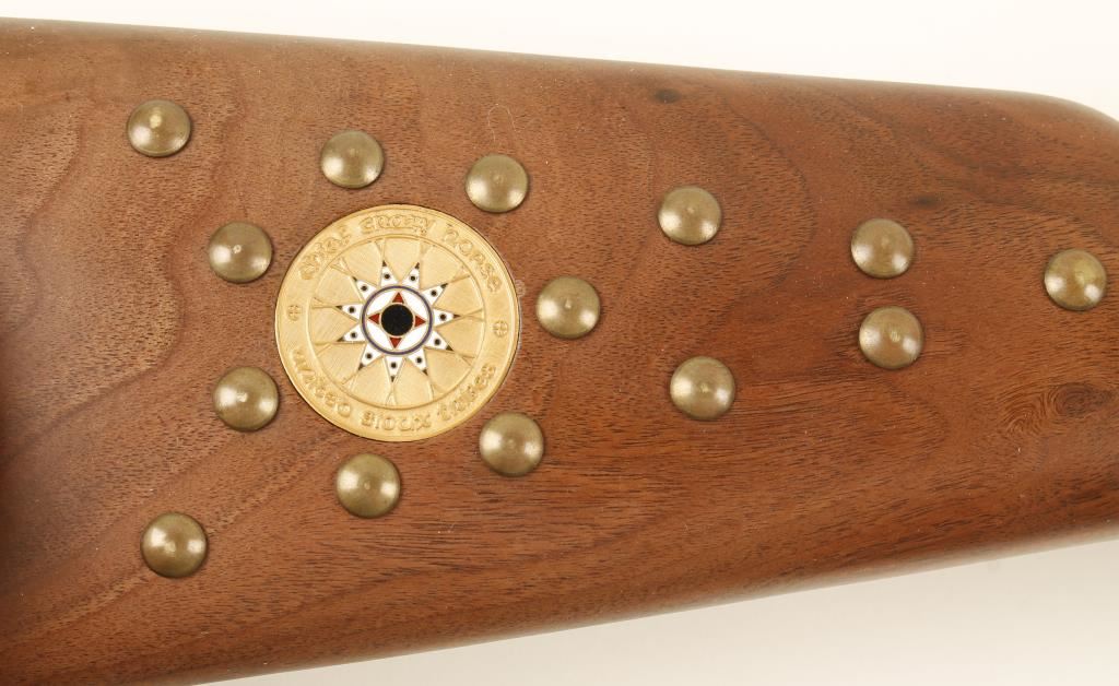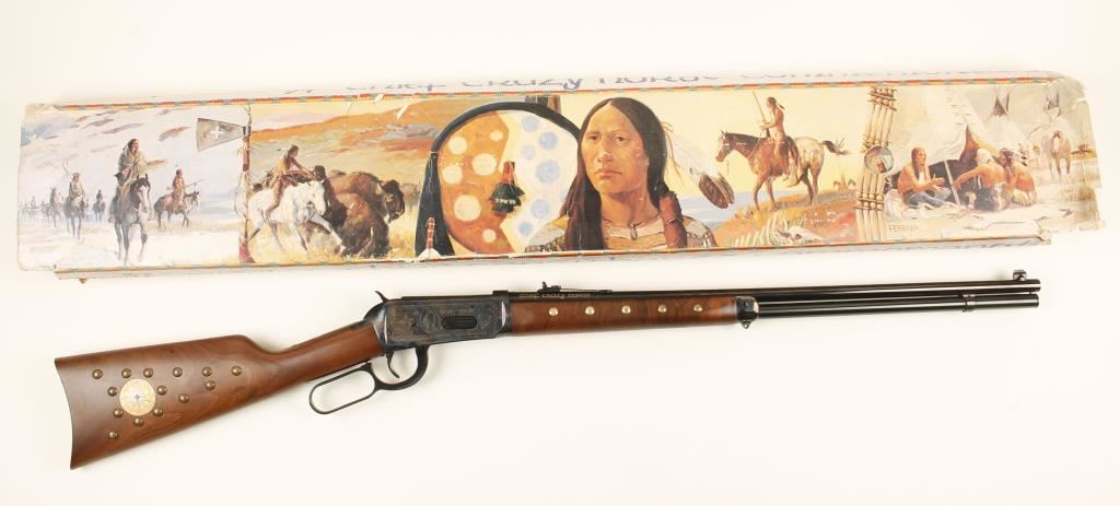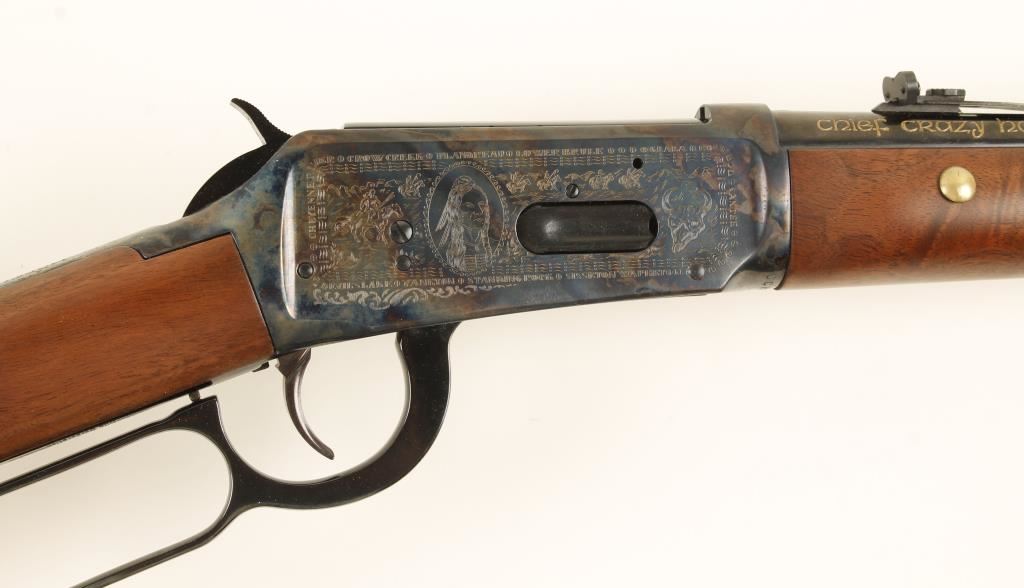 SN: CGH6531 Winchester model 94' Chief Crazy Horse Commemorative lever action rifle in .38-55 Win. Blued 24" barrel, full tube magazine, case hardened and engraved receiver with buffalo hunting scene and portrait of Chief Crazy Horse. Satin finished Walnut straight grip stock with 'brass tacks' and Chief Crazy Horse medallion. Comes with original box serial numbered to gun. Condition is excellent.