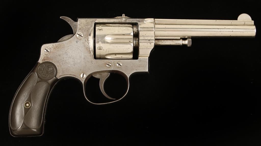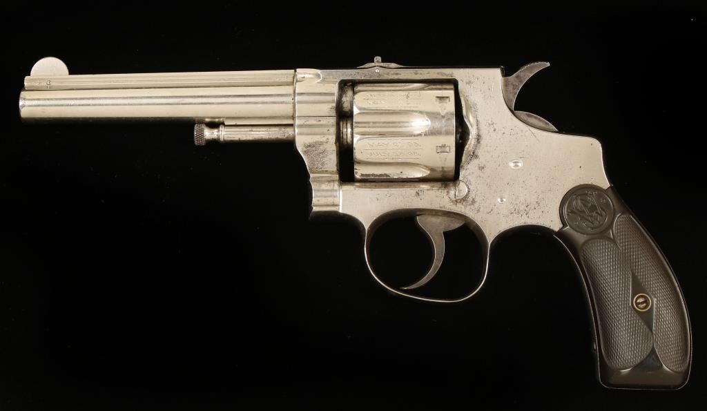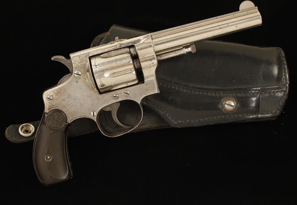 1st model, nickel plated double-action 6-shot revolver with a 4-1/4" barrel. Approximately 65% original nickel finish remaining with much pin pricking and small spots of rust. The hard rubber grips are in very good condition with some areas of worn checkering. The roll-stamping on the cylinder is sharp as is the trade mark on the side plate. The bore looks a little rough but there is rifling. The chambers are in good shape. Function is fine. Includes a C. A. Hoffman & Son black leather holster. Condition is good to fair. *Modern Firearm*