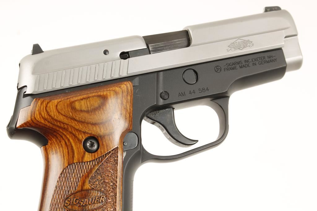 Compact double action only semi automatic pistol chambered in .40 Smith & Wesson, named "Sig Anti Snag" and designed for conceal carry. Features a 3.9" blued barrel, melt treated stainless steel slide, front night sight, black anodized German made frame, smooth trigger, Hogue Extreme series G-10 grips and a twelve round magazine. Bore is good and grip screws are slightly buggered. Condition is very good+. ***Modern Firearm***