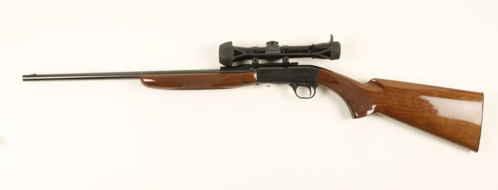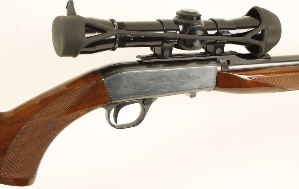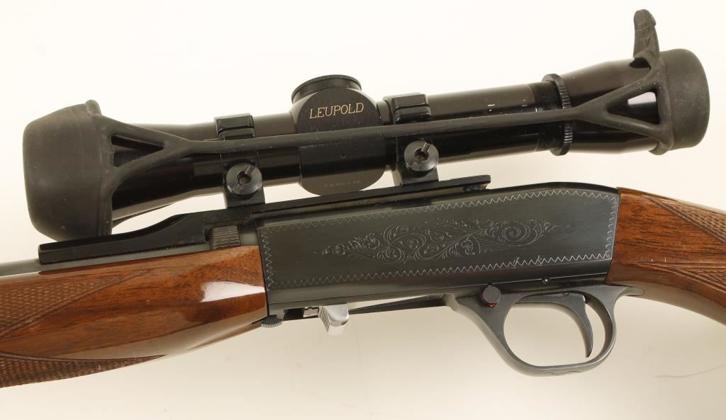 Blued "Made in Japan" semi-automatic takedown rifle with a 19-1/4" barrel and a Leupold 4X RF Special scope with a duplex reticle. With manuals for rifle and scope. Bluing is almost flawless with only a few scratches on the left side of the receiver, the scope body and wear with surface rust to the buttplate. Bore is pristine. Action is flawless. Wood stock has checkered panels at forend and wrist and shows very little wear or marks to the finish. Included is a bikini scope cover. Condition is very good. *Modern Firearm*