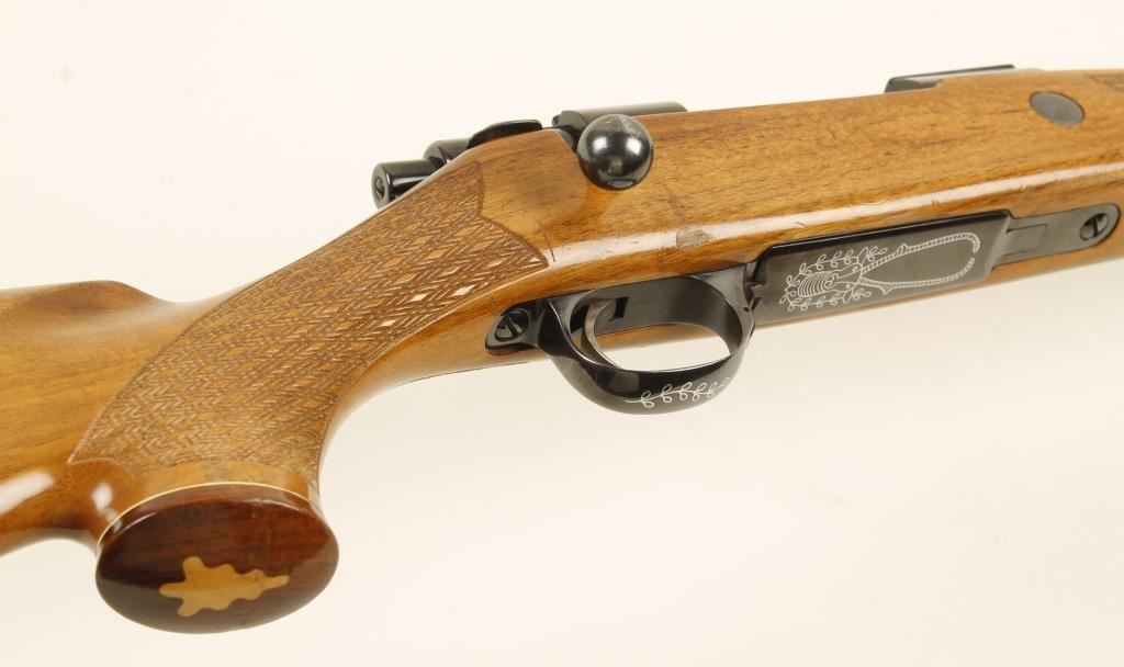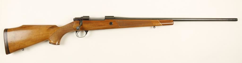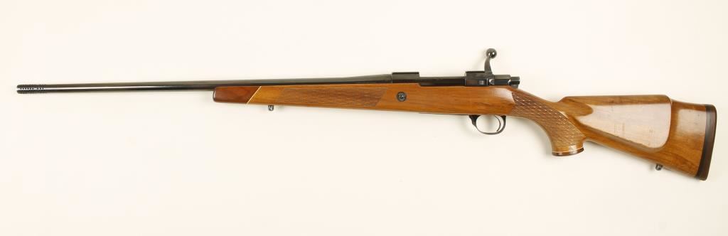 DeLuxe lightweight. Blued bolt-action rifle with a 22-1/2" Bofors Steel barrel and 1-7/8" muzzle brake, sling studs, hinged floorplate and Decelerator recoil pad. Bright polish bluing is in good condition with edge and high point wear. Some engraving is on the floorplate and trigger guard. The screw heads are lightly bent but not buggered. There is a crossbolt. The bore is mirror bright with strong rifling. Action is smooth with a nice light trigger. Stock is a blonde wood with walnut grip and forend caps over whiteline spacers. There are skip line checkering panels on the forend and the wrist. There are numerous dings, rubs and scratches as well as crazing of the varnish. There is a blonde wood inlay in the grip cap. 13-3/4" LOP. Condition is very good. *Modern Firearm*