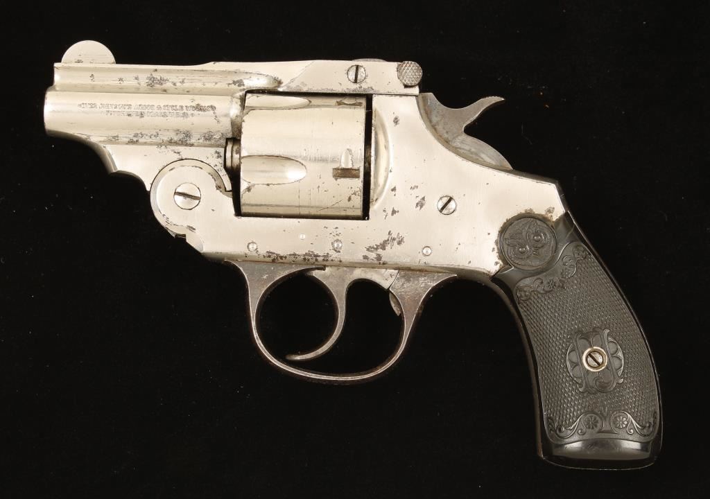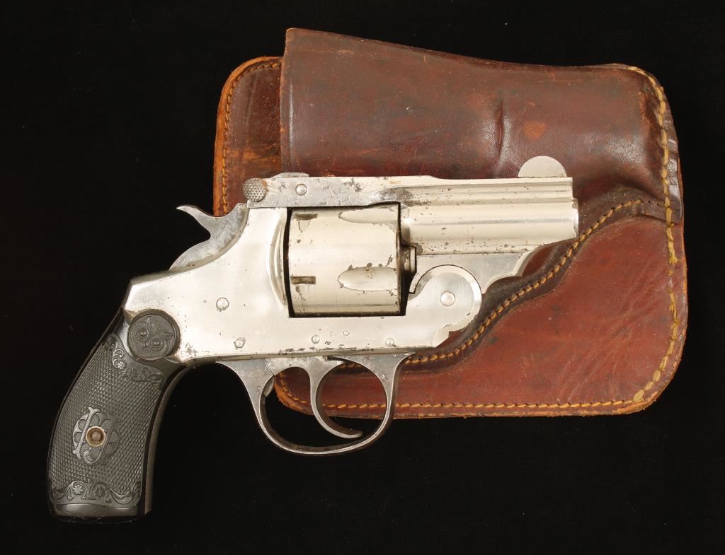 SN: C87144 Nickel plated double-action only top-break 5-shot revolver with a 2" barrel and hard rubber grips. Plating is not bright with dings, scratches and perforations gone to rust. Blued trigger, trigger guard and hammer have wear and grey/brown patina with light pitting. Bore is shiny with strong rifling and some rust/pitting. Chambers are shiny with combustion discoloration. Action is smooth and the lock-up is tight. "Owl Head" grips are complete with only a few dings and scratches. Includes an Iver Johnson leather pocket holster *Modern Firearm*