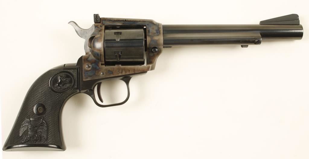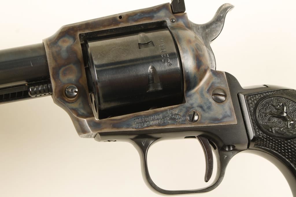 Single action six shot revolver chambered in .22 Magnum by Colt. Features a 6" blued barrel, adjustable sights, blued cylinder, backstrap, and trigger guard, case hardened frame, and old style black plastic eagle grips. Condition is very good retaining 94% original blue with only slight wear at muzzle and a few select places. ***Modern Firearm***