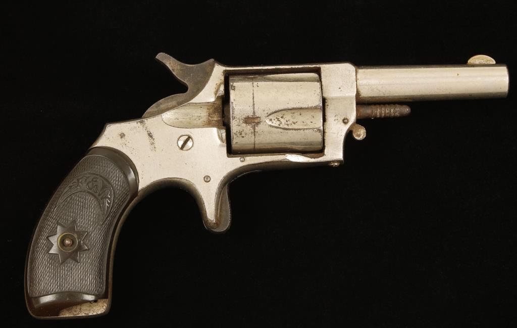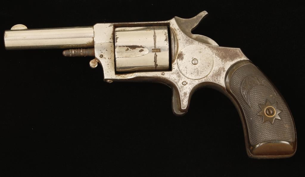 SN: 15859 Nickel plated single-action spur trigger rimfire revolver with a 2-1/2" barrel and hard rubber grips. Plating is dull from wear and scratching with perhaps 75% remaining. The exposed metal has gone to a rust brown patina. There is a drag line. The bore is dark with sharp rifling and pitting. The chambers are dull with pitting and surface rust. The cylinder pin is stuck. The action works well and lock-up is good. Grips have a piece missing from the bottom of the right grip and a few scratches and dings. Condition is good. *Antique Firearm*