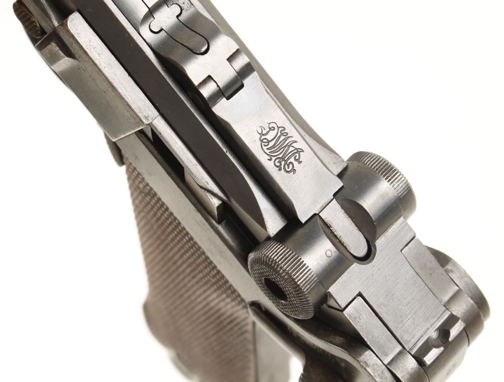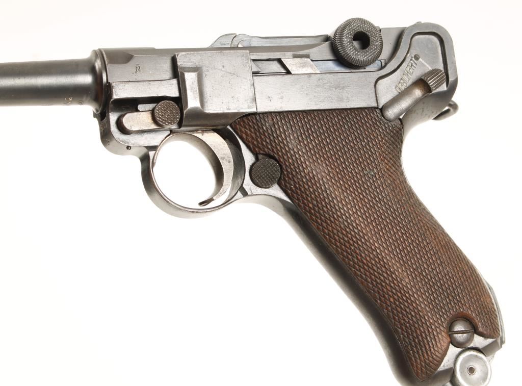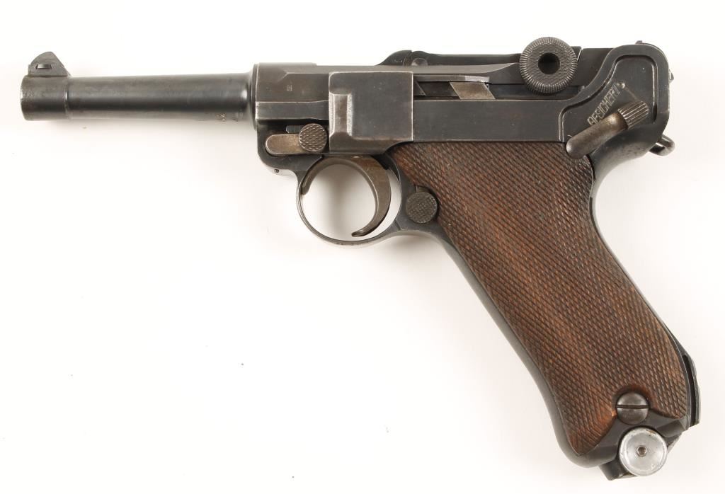 German made semi automatic hammerless pistol chambered in .30 Luger. Features 3 7/8" blued nitro proofed barrel, stock lug, checkered wood grips, thumb safety, later model extruding magazine. Matching serial numbers on barrel, frame, side plate, lock bolt, rear toggle link and on later model magazine. Bore is heavily pitted with an appearance of rifling, straw is darkened but visible, grips are worn semi smooth and side plate, frame and muzzle have wear and light pitting. Condition is very good. ***Modern Firearm***