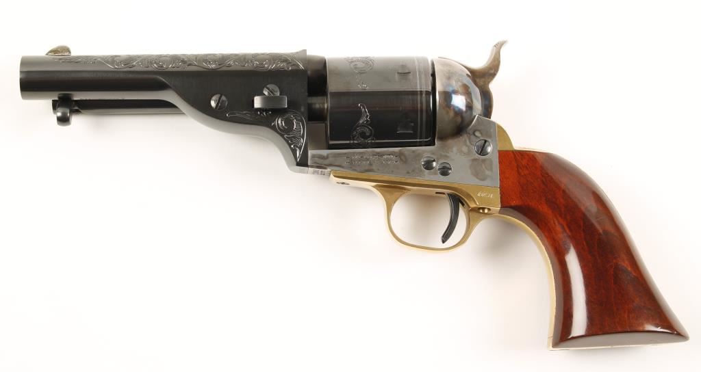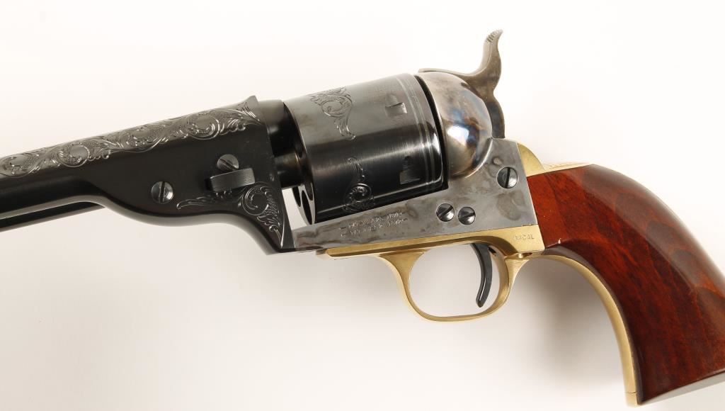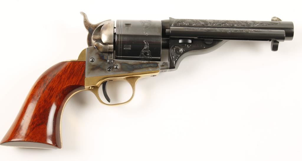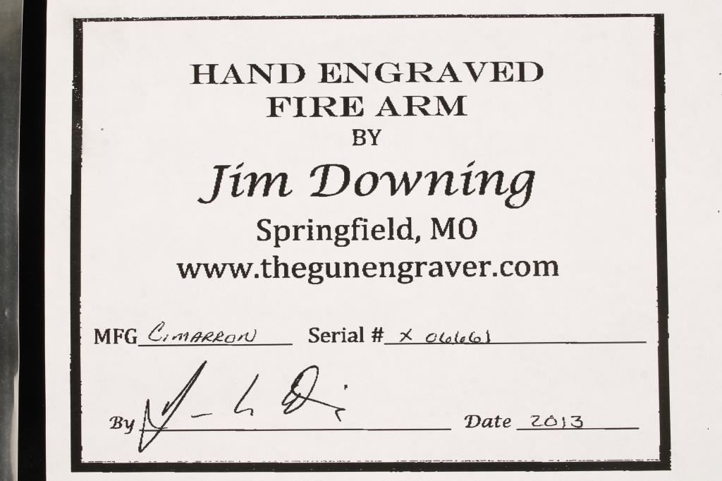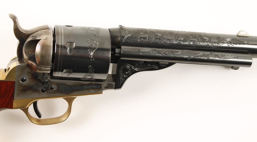 Engraved Italian made six shot single action revolver chambered in .44 Colt, modeled after the 1872 Colt Open Top. This revolver has been finely engraved and inlaid by Jim Downing and been custom finished, tuned, honed and fitted. Features an engraved 4.75" sheriff's length blued barrel, fixed sights, blued engraved cylinder. case hardened frame and hammer, blued trigger, one piece walnut grips engraved brass backstrap and brass trigger guard. Bore is perfect and appears unfired. This gun appears in Jim Downing's book "The gun Engraver" Condition is like new in box. Includes a letter from Jim Downing that is signed and names manufacture and serial number and date in which he engraved it. ***Modern Firearm***
