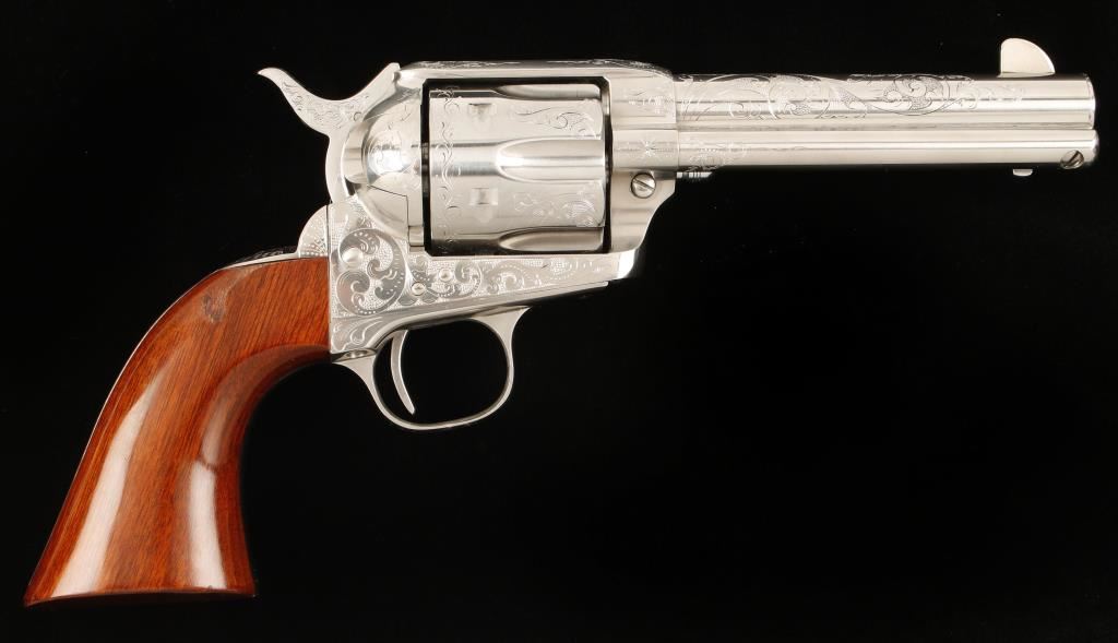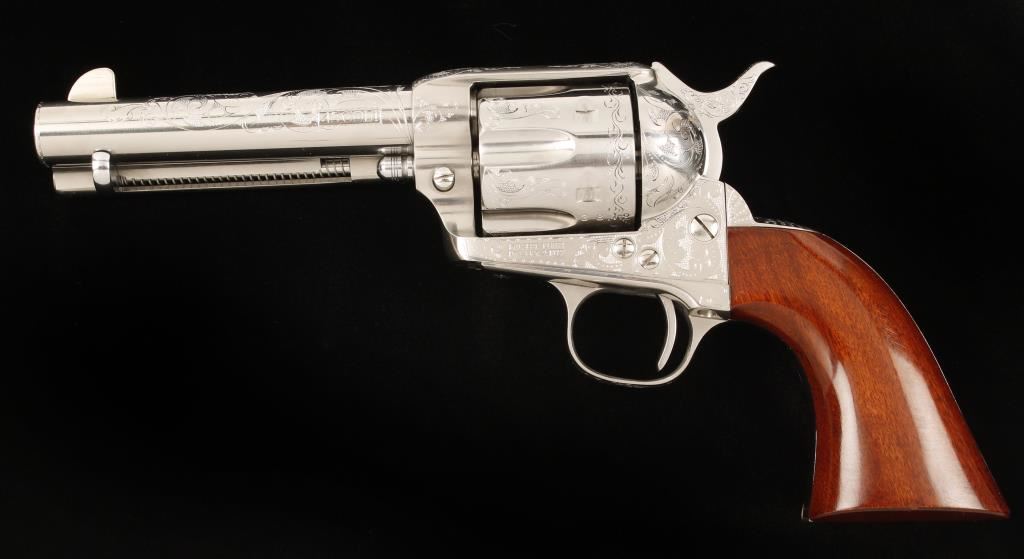 Laser engraved six shot single action revolver chambered in .45 Colt and manufactured by A. Uberti. Features an engraved 4.75" polished stainless steel barrel, blade front sight, one piece walnut grips, and polished and engraved stainless steel cylinder, frame, hammer, backstrap and trigger guard. Bore is excellent. Condition is like new in box. ***Modern Firearm***