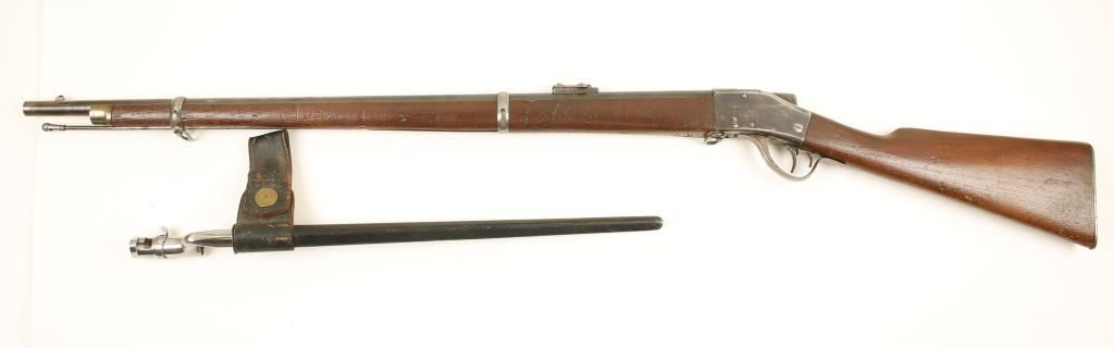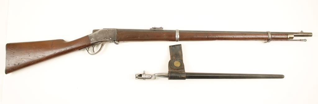 An internal hammer breech loading military rifle in .45-70 caliber by Sharps Rifle Manufacturing. Features a 32.25" blued barrel, front sight on bayonet lug, military style long range adjustable rear sight, sliding safety trigger lock, two barrel bands, ramrod, metal butt plate, full stock and bayonet with scabbard. Patent line reads "PAT OFC. 1876." Condition is good 40%+ original bluing remaining with rough stock. ***Antique Firearm***