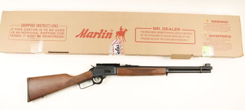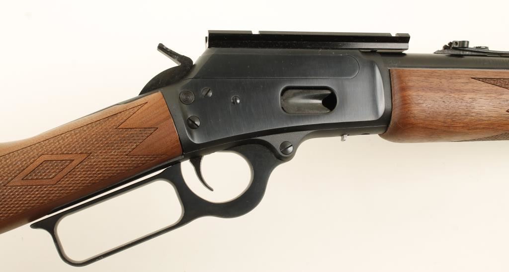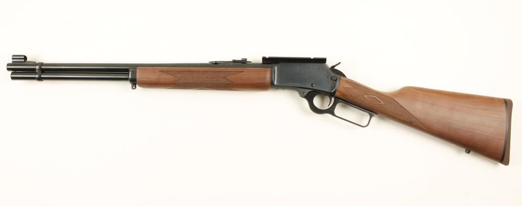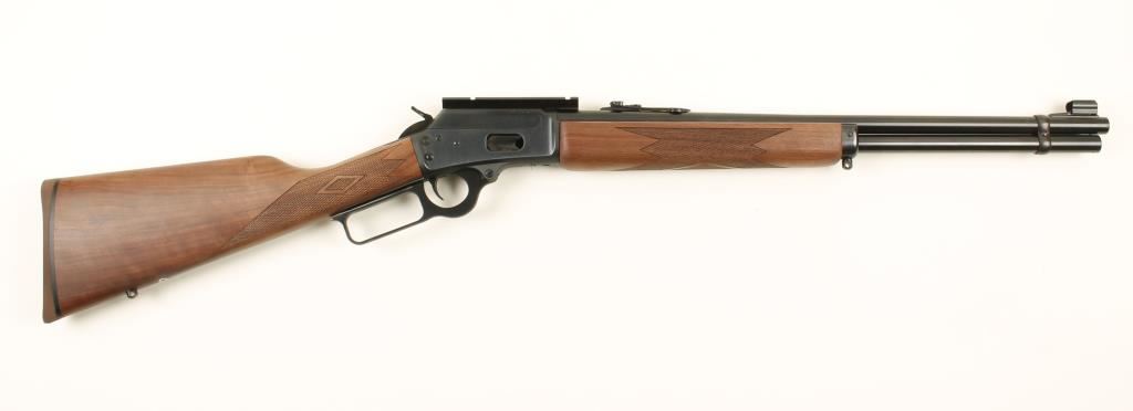 Blued lever action carbine with a 20" barrel, factory box, security lock, weaver scope rail and documents. Also marked for .44 Special ammunition. Metal finish is flawless. Bore is pristine. Action is fine. Wood has checkering on the forend and the butt stock wrist. There are no marks on the wood although the right side of the stock is fitting poorly and exposes the sides of the tangs. Condition is near new. *Modern Firearm*