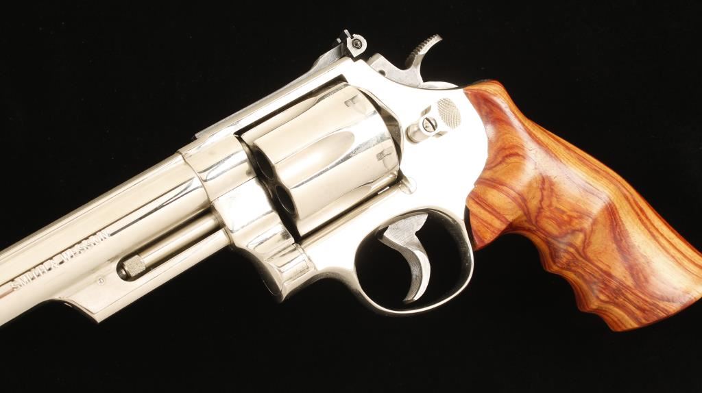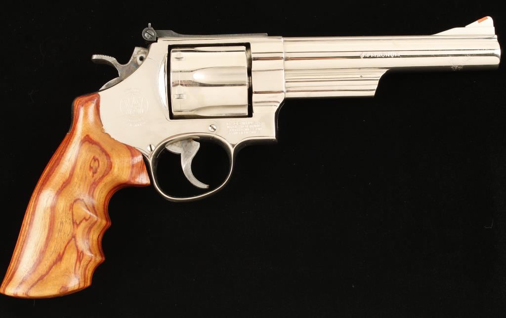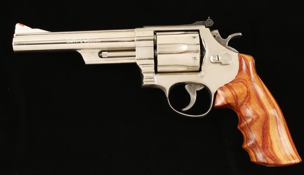 Large frame six shot revolver in .44 Magnum by Smith & Wesson. Features a 6" nickeled barrel, ramped front sight with orange insert, adjustable rear sight, nickeled frame and cylinder, case hardened hammer and trigger and one piece wood grips. Condition is very good. ***Modern Firearm***