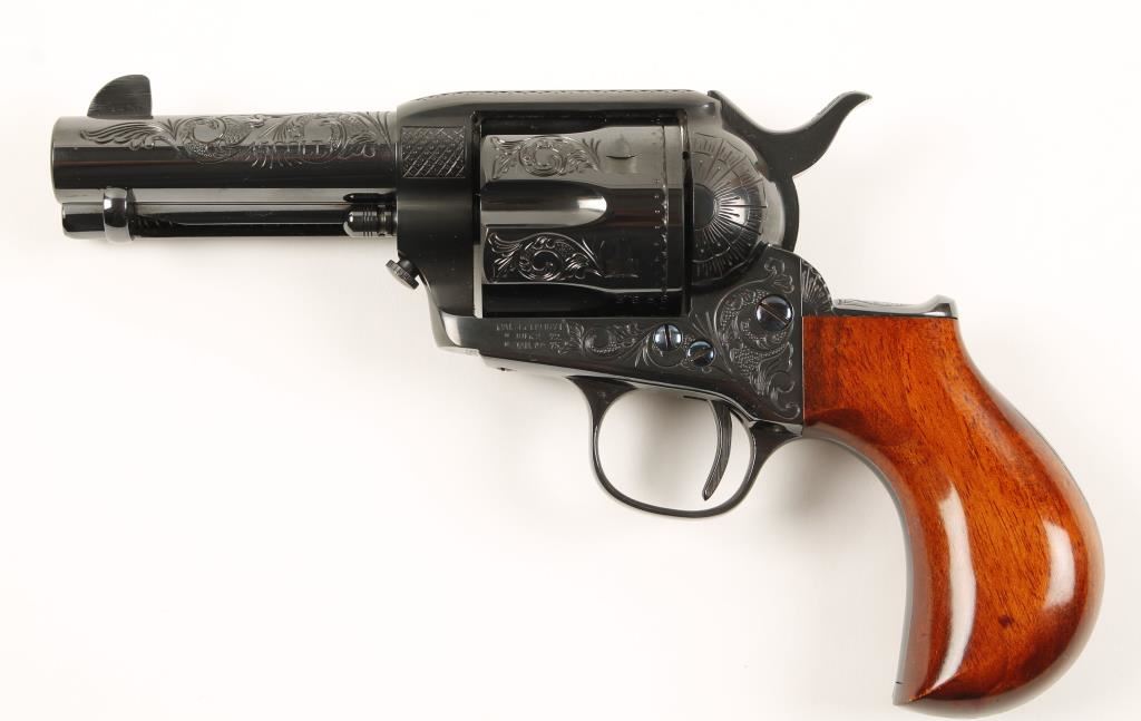 Engraved Italian made six shot single action revolver chambered in .45 Colt, modeled after the 1877 Colt and manufactured by A. Uberti. Custom fully blued finish and fully engraved by well-known artist Jim Downey "The Gun Engraver" and featured in his book of engraving . Features a 3.5" blued engraved barrel, blued engraved cylinder, frame & backstrap, blued hammer, trigger, trigger guard and cylinder pin and one piece birds head walnut grips. Bore is excellent and likely unfired. Condition is like new in box. Includes a letter from Jim Downing that is signed and names manufacture and serial number and date in which he engraved it. ***Modern Firearm***