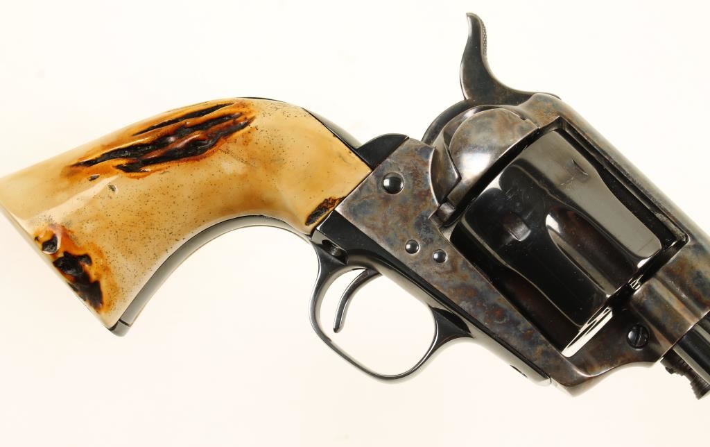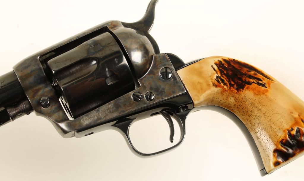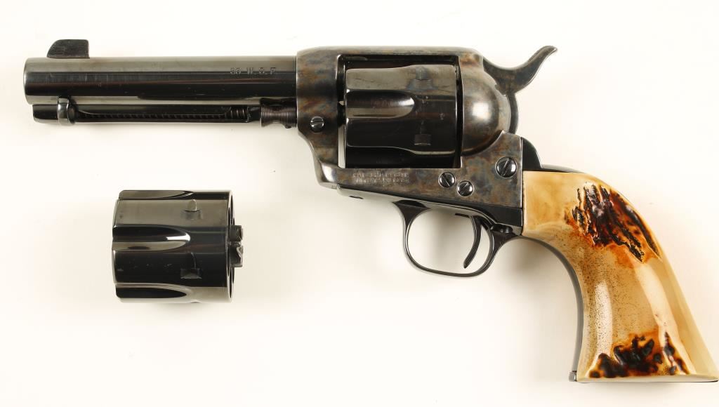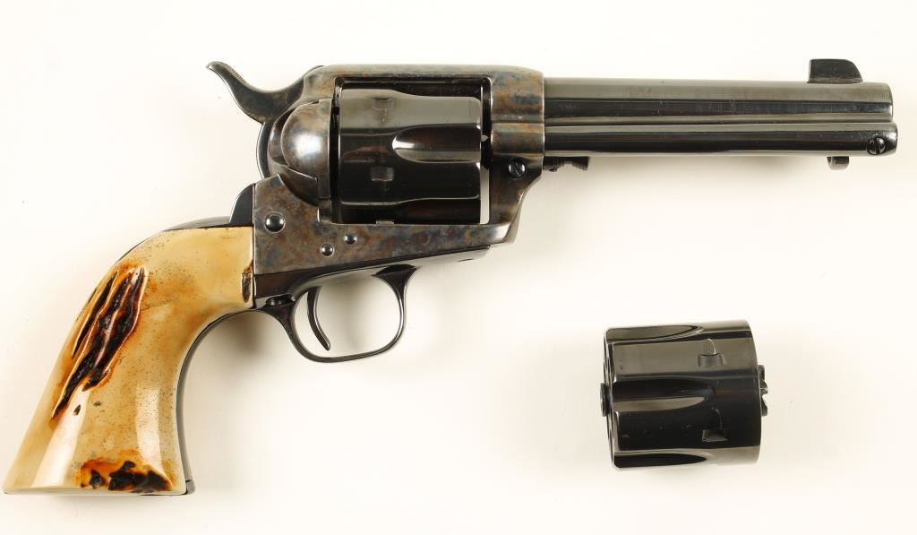 1st generation professionally refinished blued and case-colored single-action 6-shot revolver with a 4-3/4" barrel and stag grips. Made in 1901. The cylinder pin is a modern replacement and there is another modern cylinder included as well. There is no serial number on the trigger guard but the numbers on the frame and grip frame match. Bluing is excellent with only a few scratches near the ejector rod. Original cylinder has rounded lines on bolt notches. All the chambers are in good condition. Case hardening is bright and colorful with no deficiencies. Bore is mirror bright with sharp rifling. Action is good with good lock-up. Grips are in good shape. Condition is excellent. *Modern Firearm*