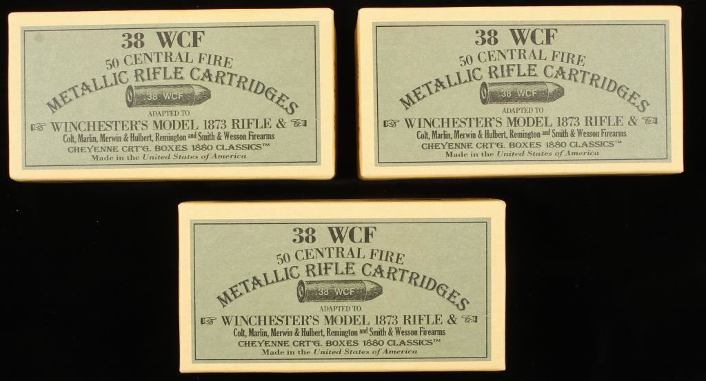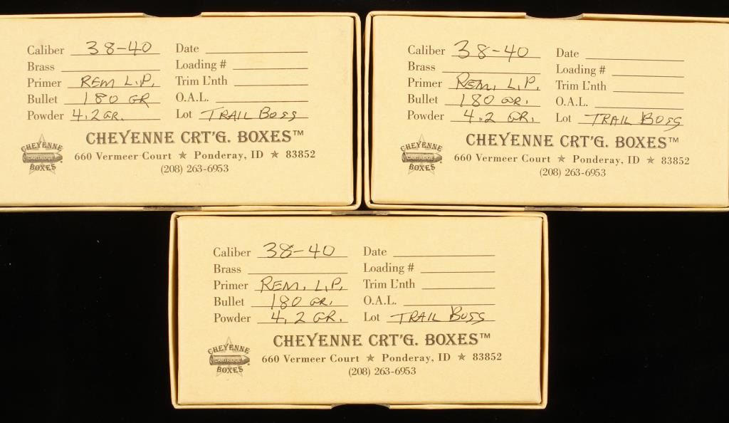 150 Rounds of .38-40 ammunition with 180 grain bullets, Remington L.P. primers, loaded with 4.2 grain of powder and in Winchester Western brass cases. In vintage looking Cheyenne Cartridge Boxes.