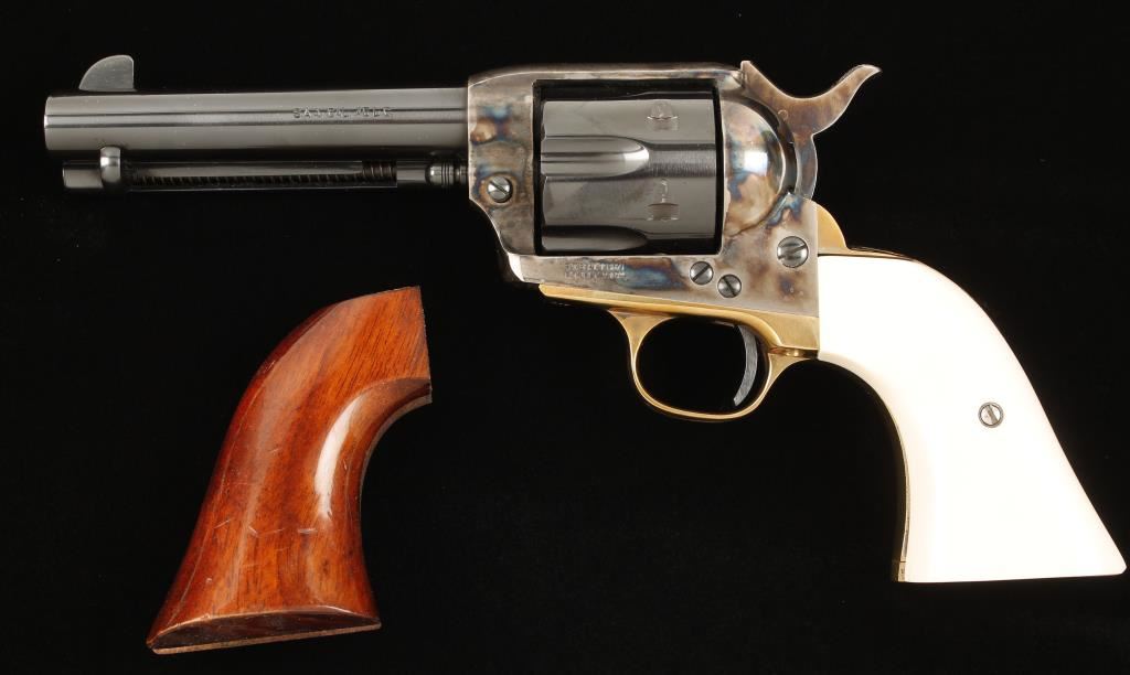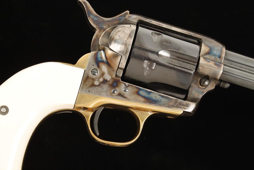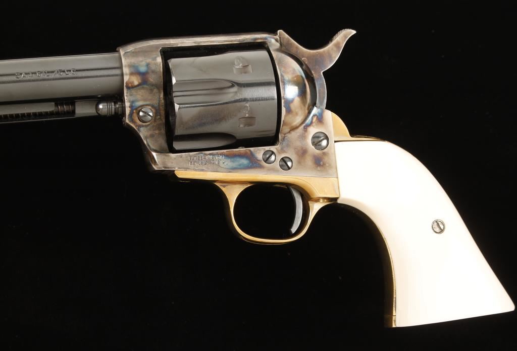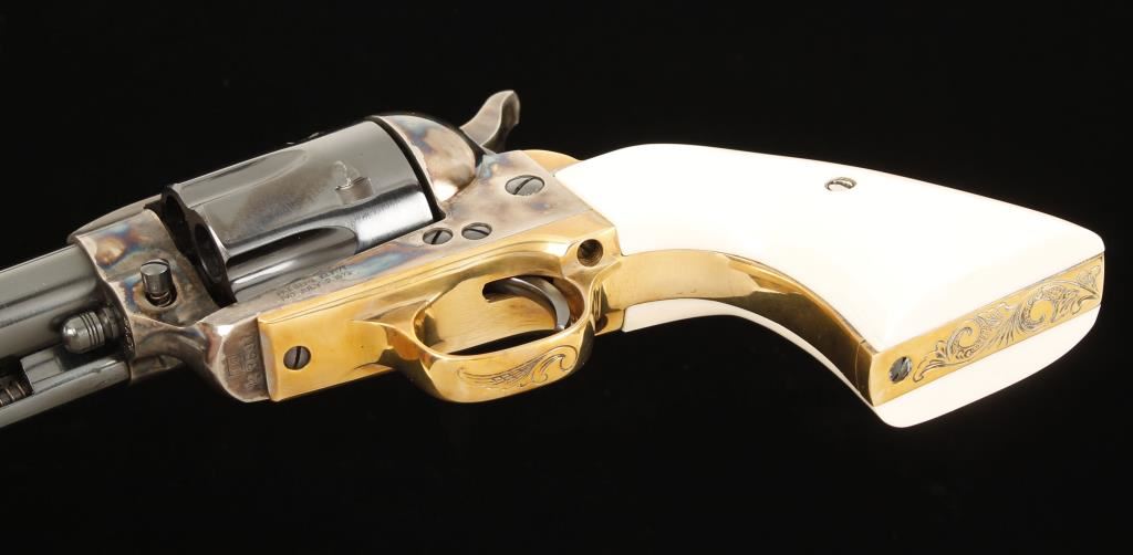 Engraved six shot single action revolver chambered in .45 Long Colt, marked Tristar, Regulator. Features 4.75" blued barrel, front blade sight, blued cylinder and trigger, case hardened frame and hammer, simulated ivory Gunfighter grips, gold plated trigger guard and gold plated and engraved backstrap by Jim Downing "The Gun Engraver". This revolver has had lots of tuning, honing and finish work done to it for a top collector/re-enactor. Bore is immaculate. Includes original one-piece walnut grips. Condition is like new in box. Includes a letter from Jim Downing that is signed and names manufacture and serial number and date in which he engraved it. ***Modern Firearm***