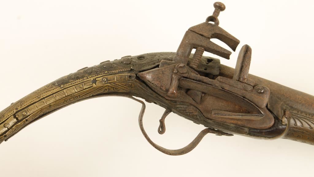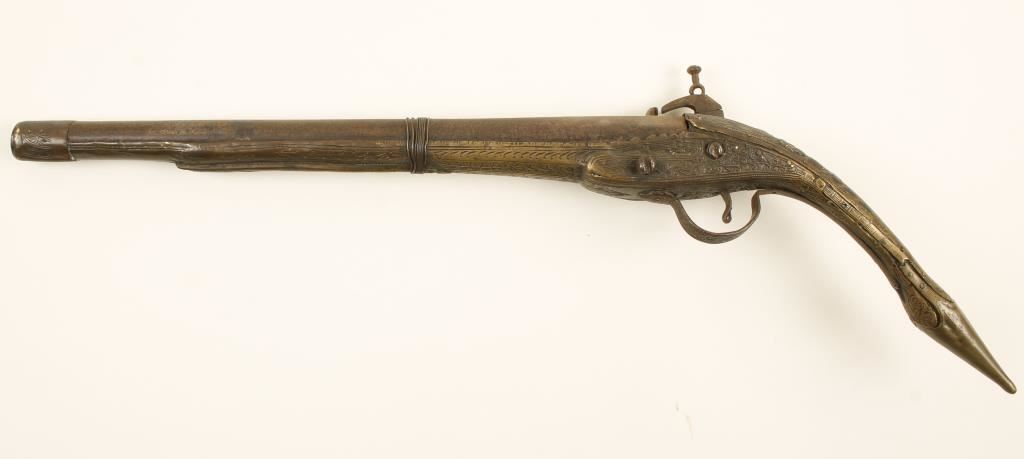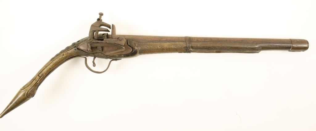 Caliber unknown. Early brass plated wood stocked flintlock which is engraved all over, barrel is wire wrapped. Condition is Fair.