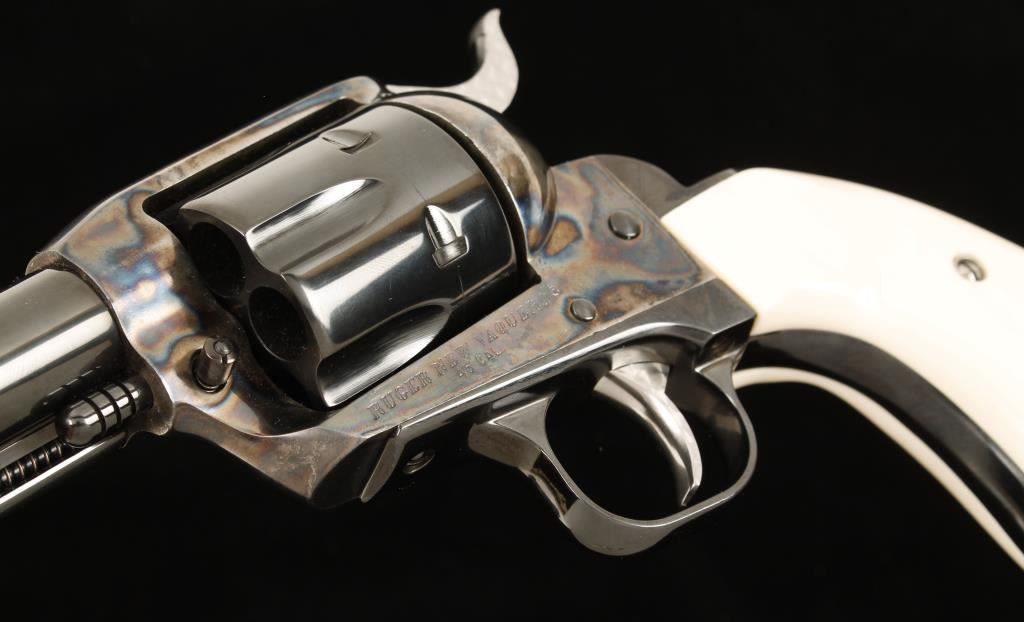 Engraved six shot single action revolver chambered in .45 caliber. This revolver has been extensively reworked, honed, fitted, tuned and re-finished to the highest quality done by a top cowboy action shooter/re-enactor. Features a 4.5" blued barrel, case hardened frame, blued cylinder & trigger guard, jeweled trigger & hammer, simulated ivory Gunfighter grips and blued and engraved backstrap inscribed "Hell's in Session" & "4 of 100". One of the first guns in a series to have this type of elaborate work done, less than ten were actually produced. Bore is exceptional. Condition is excellent in box and will also include original factory grips. *Note- Ruger New Vaquero SN: 510-15914 is done in the same fashion and is inscribed "3 of 100" to be offered as buyer's option. ***Modern Firearm***