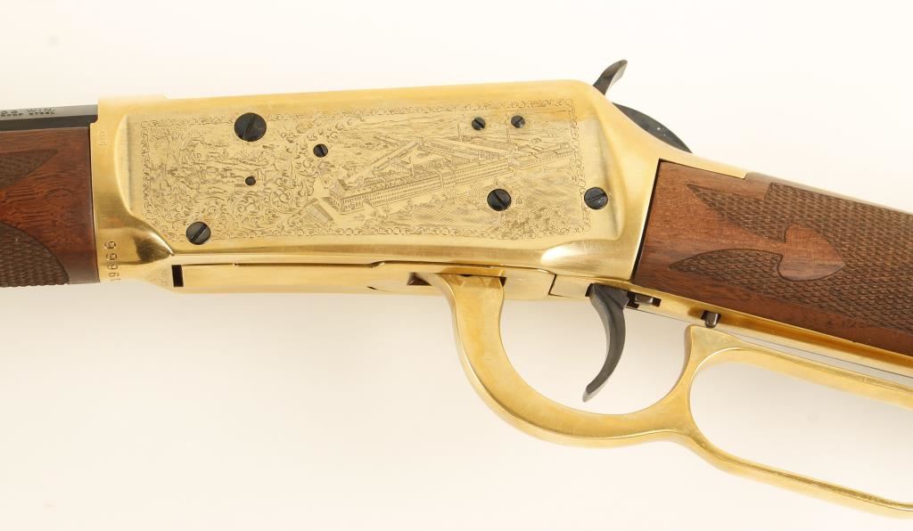 SN: OFW19666 Oliver F. Winchester model 94 lever action rifle in .38-55 Winchester. 24” octagon barrel. Blued and gold plated, engraved matte gold plated receiver, checkered walnut straight grip stock and forend adjustable rear sight, full tubular magazine, medallion in stock, original box(with matching serial numbered sticker). Condition is excellent with minor blemishes on stock.
