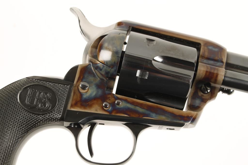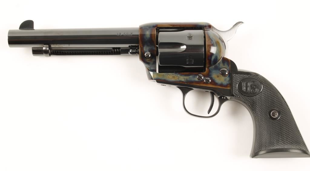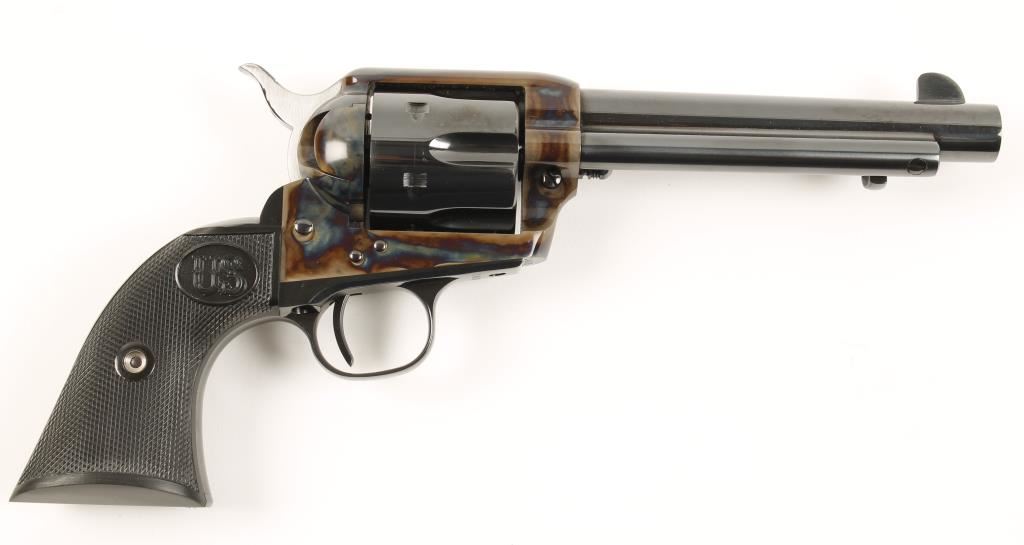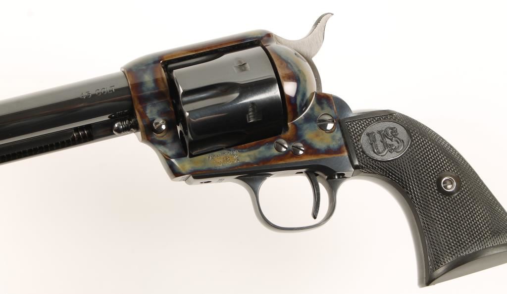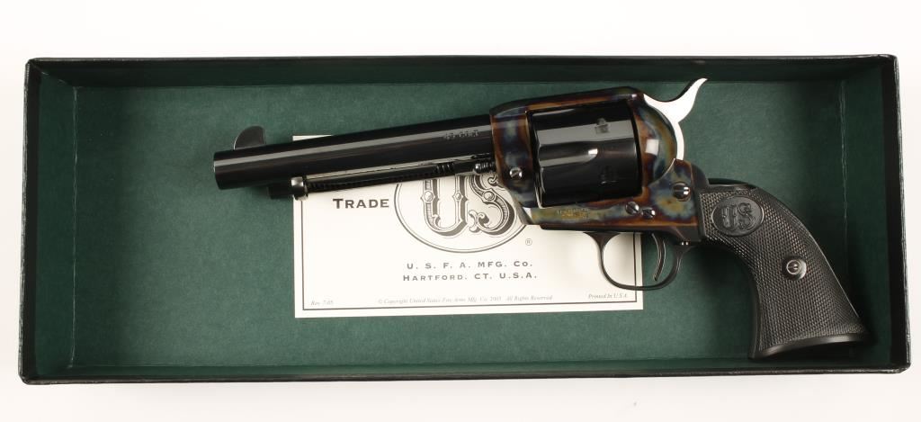 Exceptional six shot single action revolver chambered in .45 Colt. Manufactured by United States Fire Arms Mfg. who has been out of business for 5 years and these revolvers retailed for $1,250 new. Features a 5.5" Dome blue finished barrel, front blade sight, checkered black plastic grips, Armory bone case finished frame, Dome blue finished hammer, cylinder, trigger, trigger guard, back strap and ejector rod housing. Bore is excellent and entire gun shows no use, as does the box. Condition is near new in box. ***Modern Firearm***