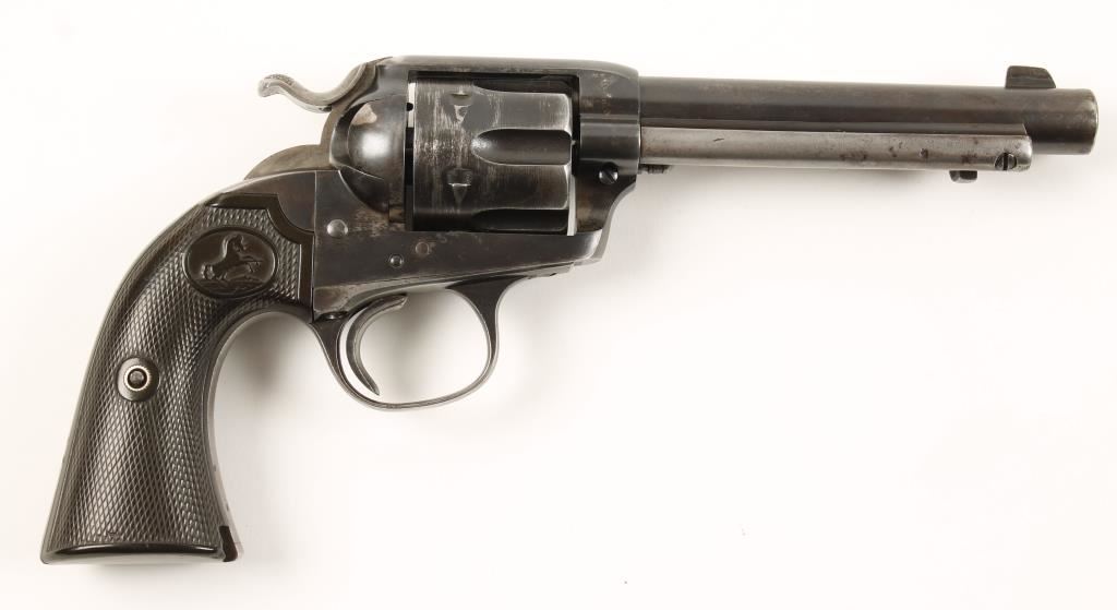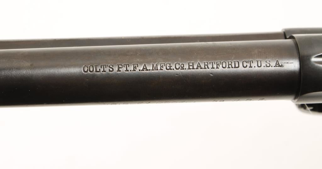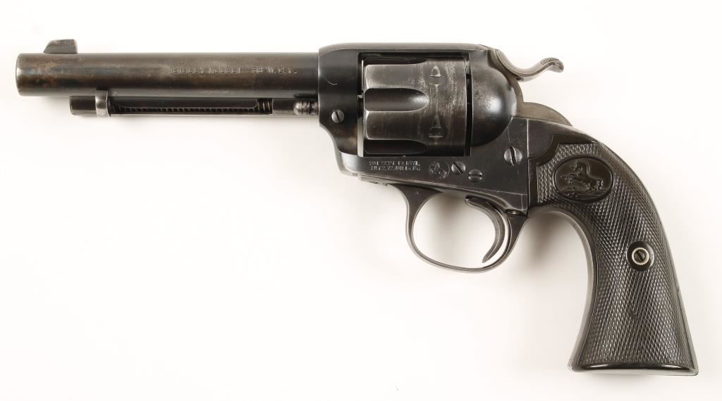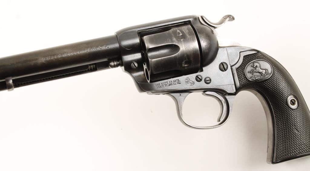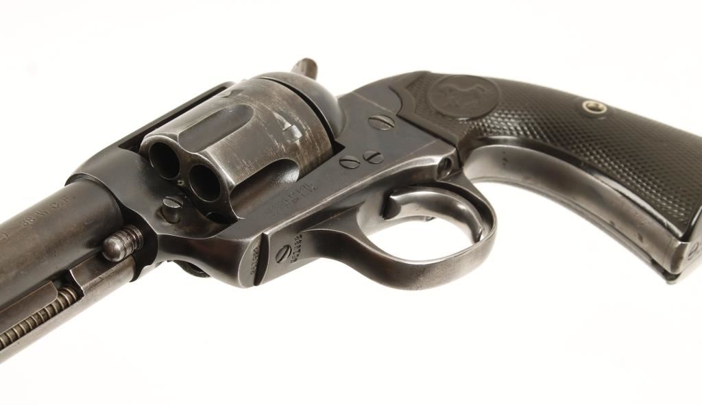 Six shot single action target revolver chambered in .38 Winchester Center Fire and manufactured in 1905. Features a 5.5" blued barrel, blade front sight, v-notch rear sight, blued steel frame with push button cylinder pin release, blued fluted six shot cylinder, wide spur hammer and checkered hard rubber grips with rampant colt decor. All matching serial numbers on frame trigger guard and backstrap. Retains 60% original blue finish, barrel markings, patent dates and logo are very apparent. Light pitting through-out, grips are worn semi-smooth and have a small chip and hammer shows traces of case coloring. Bore is good with nice rifling, action functions well without cylinder and poor with it in, need adjustment. Condition is very good. ***Modern Firearm***