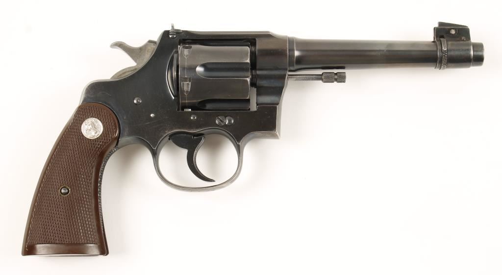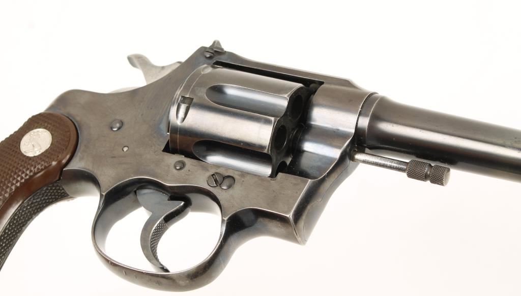 Pre-war double action target revolver chambered in .38 Special and manufactured in 1932. Theses were the top of the line revolvers in their day and were hand fitted and honed. Features a blued 6" tapered barrel, interesting Patridge style adjustable front sight, adjustable rear sight, blued and parkerized flat top frame, checkered trigger, hammer, grip straps and medallion brown plastic grips. 85%+ original blue finish remaining, markings are crisp, bore is excellent and action is very smooth. Grips are not original to this gun and do not fit perfectly. Condition is very good+. ***Modern Firearm***