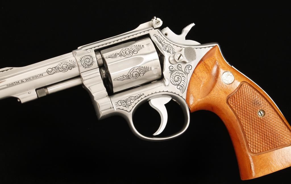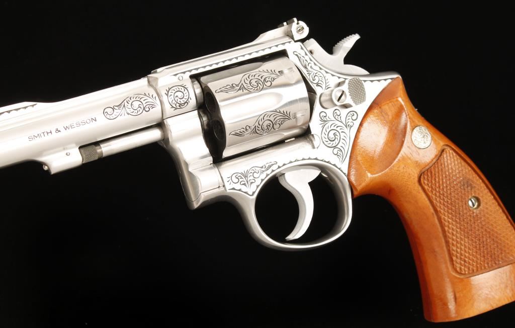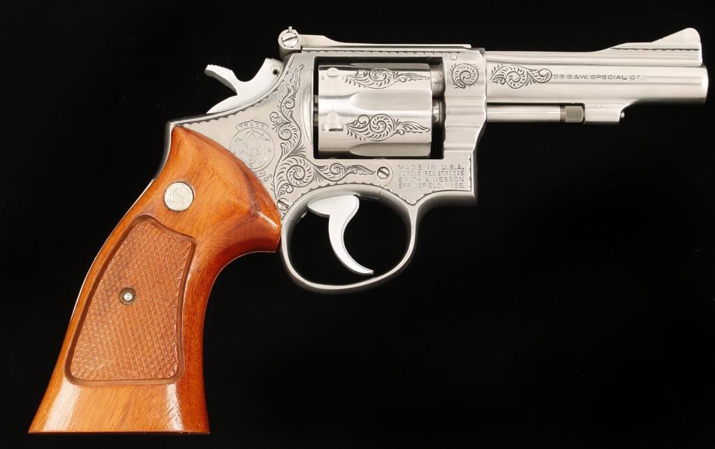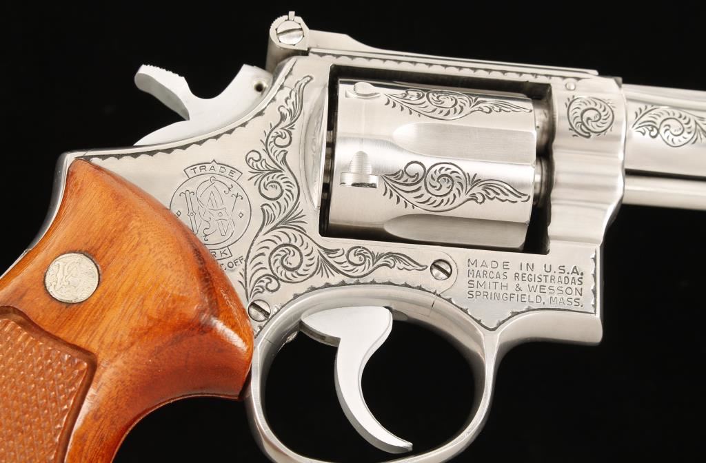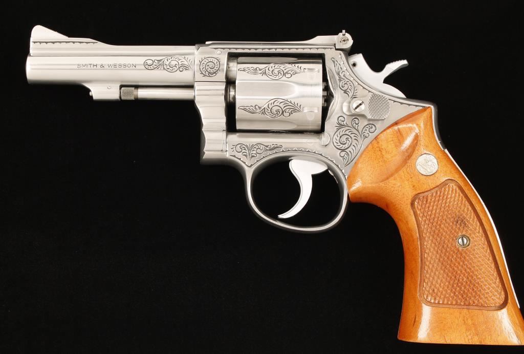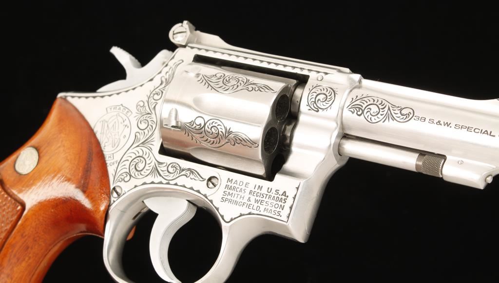 SN: 5K9558, Engraved six shot double action revolver chambered in .38 Smith & Wesson Special. Custom engraved by well known artist Jim Downing, "The Gun Engraver". Features an engraved 4" stainless steel barrel with pin and top rib, ramp front sight, stainless steel adjustable micrometer click rear sight, semi-target hammer, serrated trigger, engraved stainless steel frame and cylinder and Walnut Magna medallion grips. Bore is good with strong rifling. Condition is very good. Includes a letter from Jim Downing that is signed and names manufacture and serial number and date in which he engraved it. ***Modern Firearm***