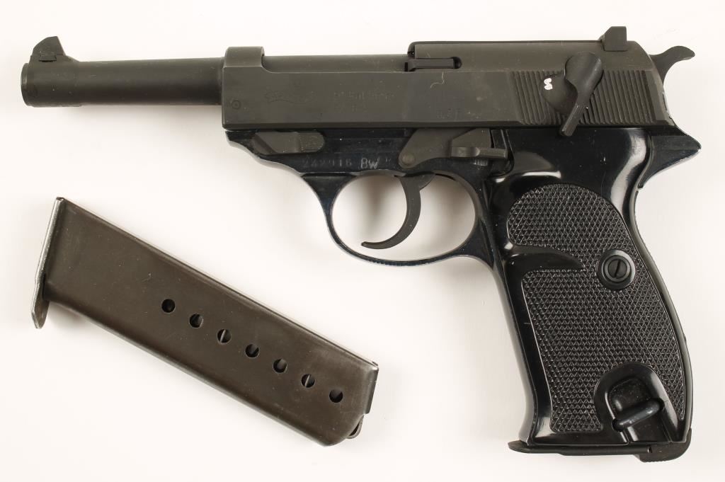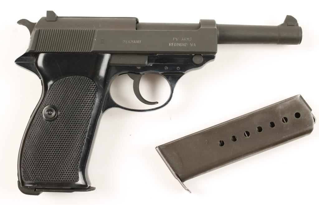 German made post war production double action semi automatic pistol chambered in 9mm Parabellum and imported by PW Arms. Features a 5" parkerized barrel, parkerized slide, hammer, trigger, and various small parts, blued alloy frame, thumb safety, fixed sights, checkered black plastic grips, lanyard ring and two magazines. Bore is excellent. Overall condition is near excellent only showing slight signs of wear on frame.